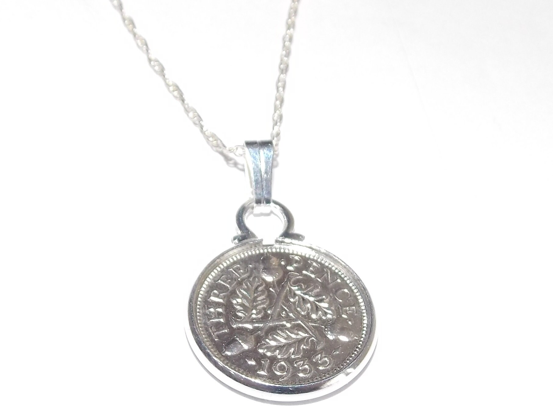 1933 Threepence Coin Pendant: 92nd Birthday Gift, Sterling Silver Chain
