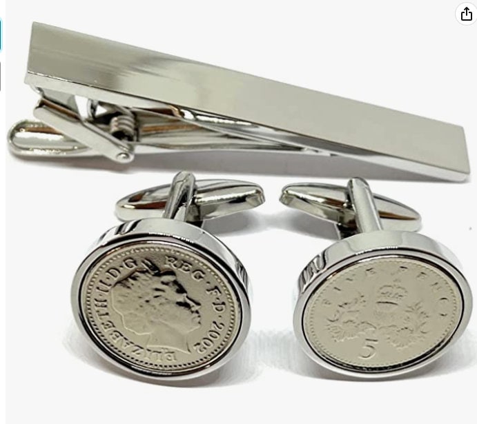 A Genuine 2002 Circulated Five pence coins cleaned and polished and made into Cufflinks A great gift for a 23rd Birthday or Anniversary. A nice pendant Box supplied
