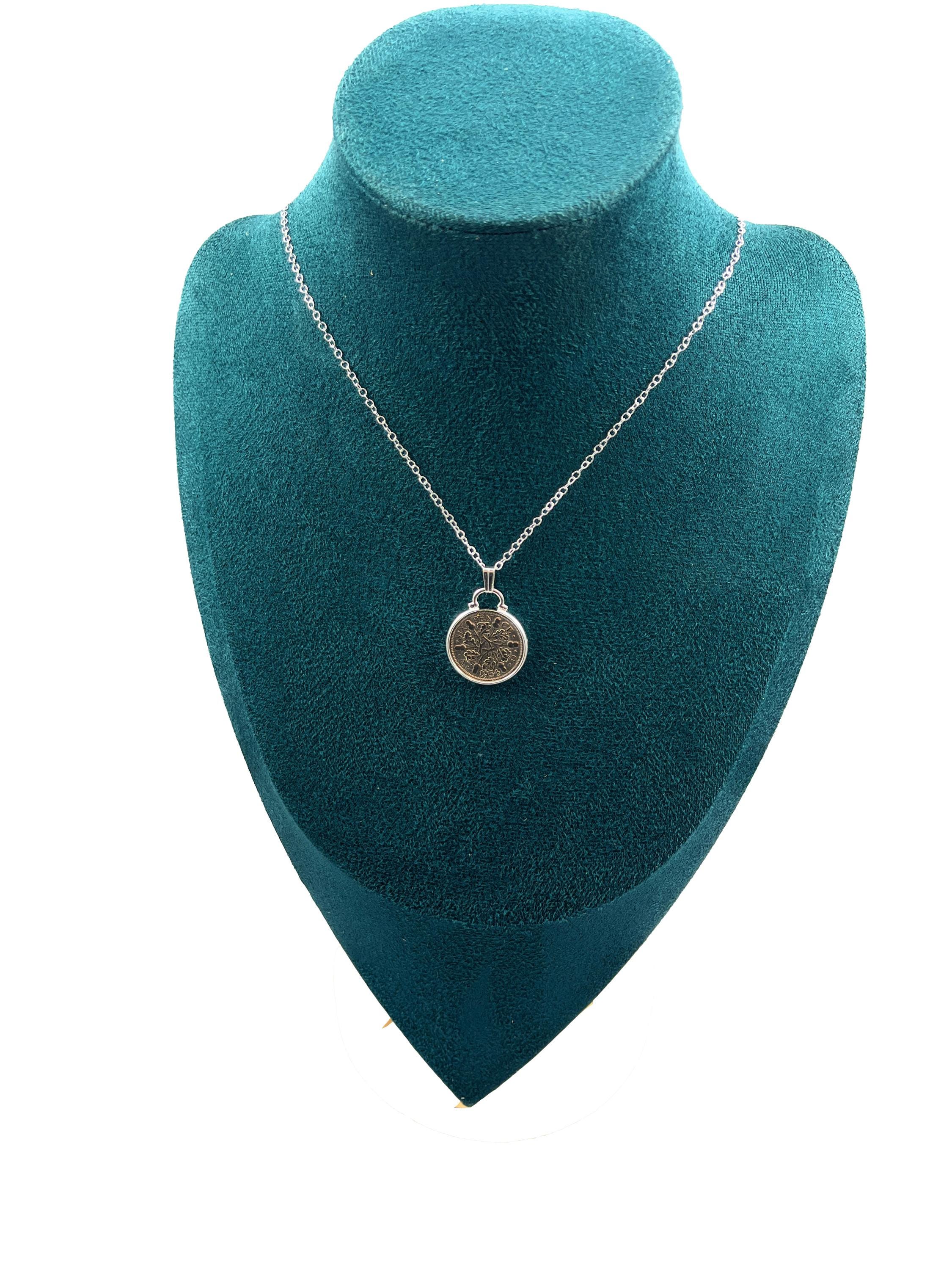A genuine circulated 1934 hand polished sixpence attached to a silver plated pendant mount