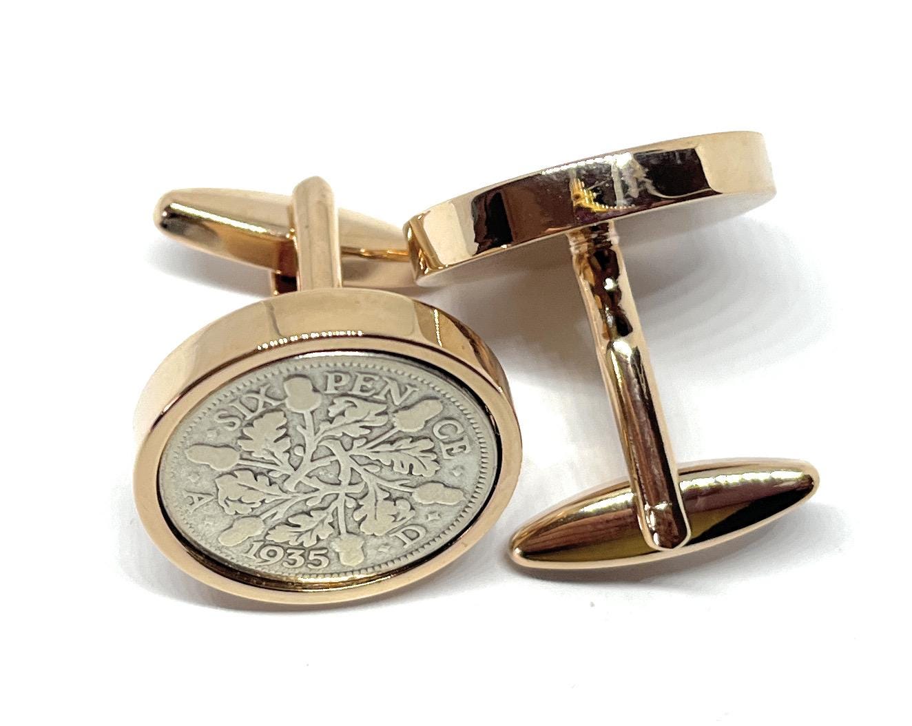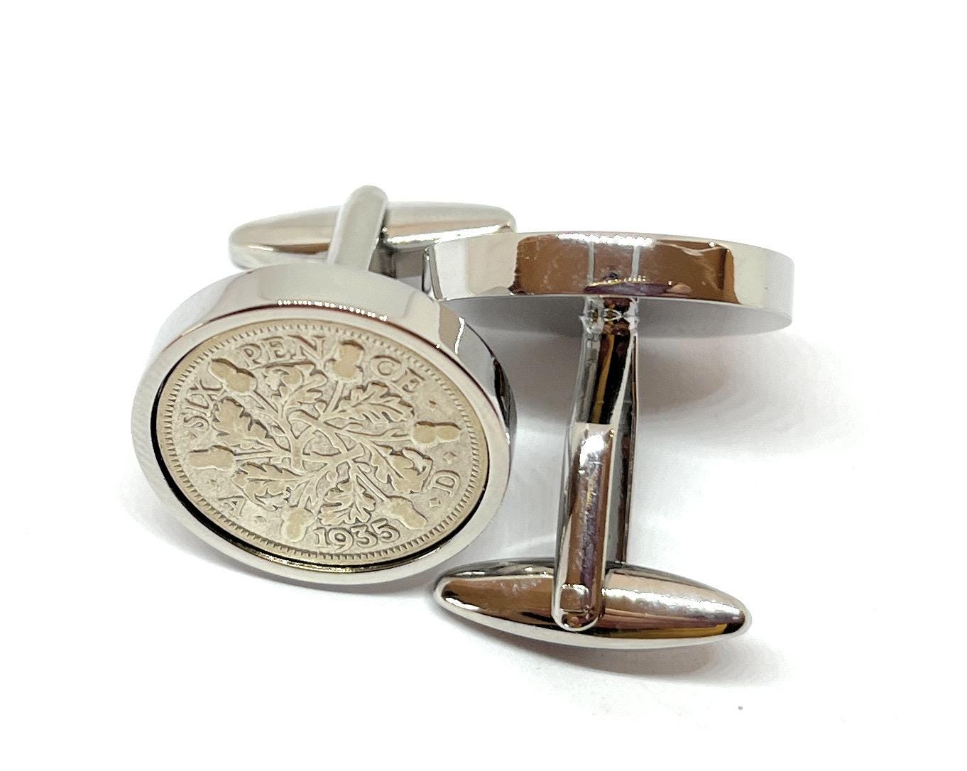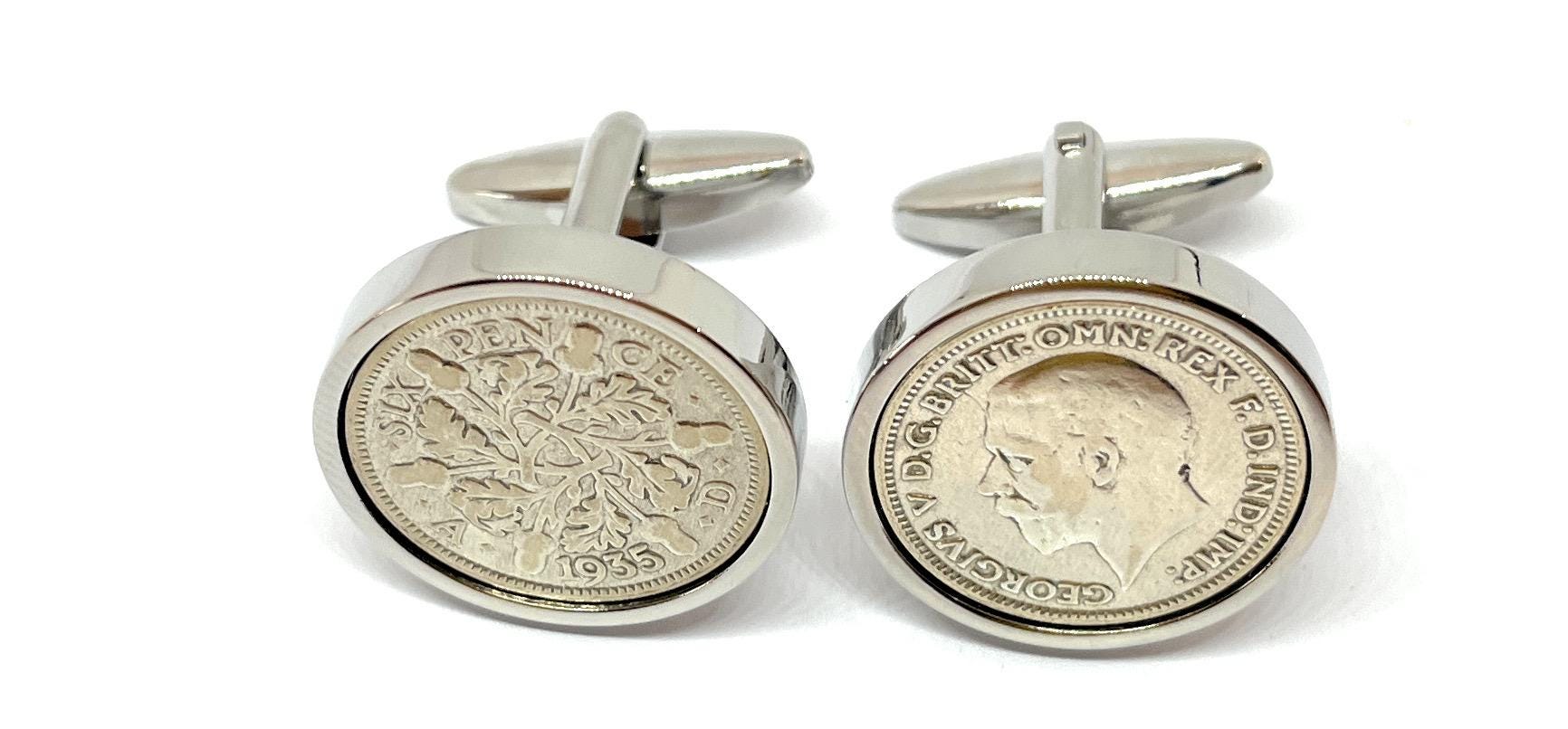 Genuine British Sixpence 6d coin cufflinks mounted in Silver, Gold or Rose Gold plated cufflink backs.