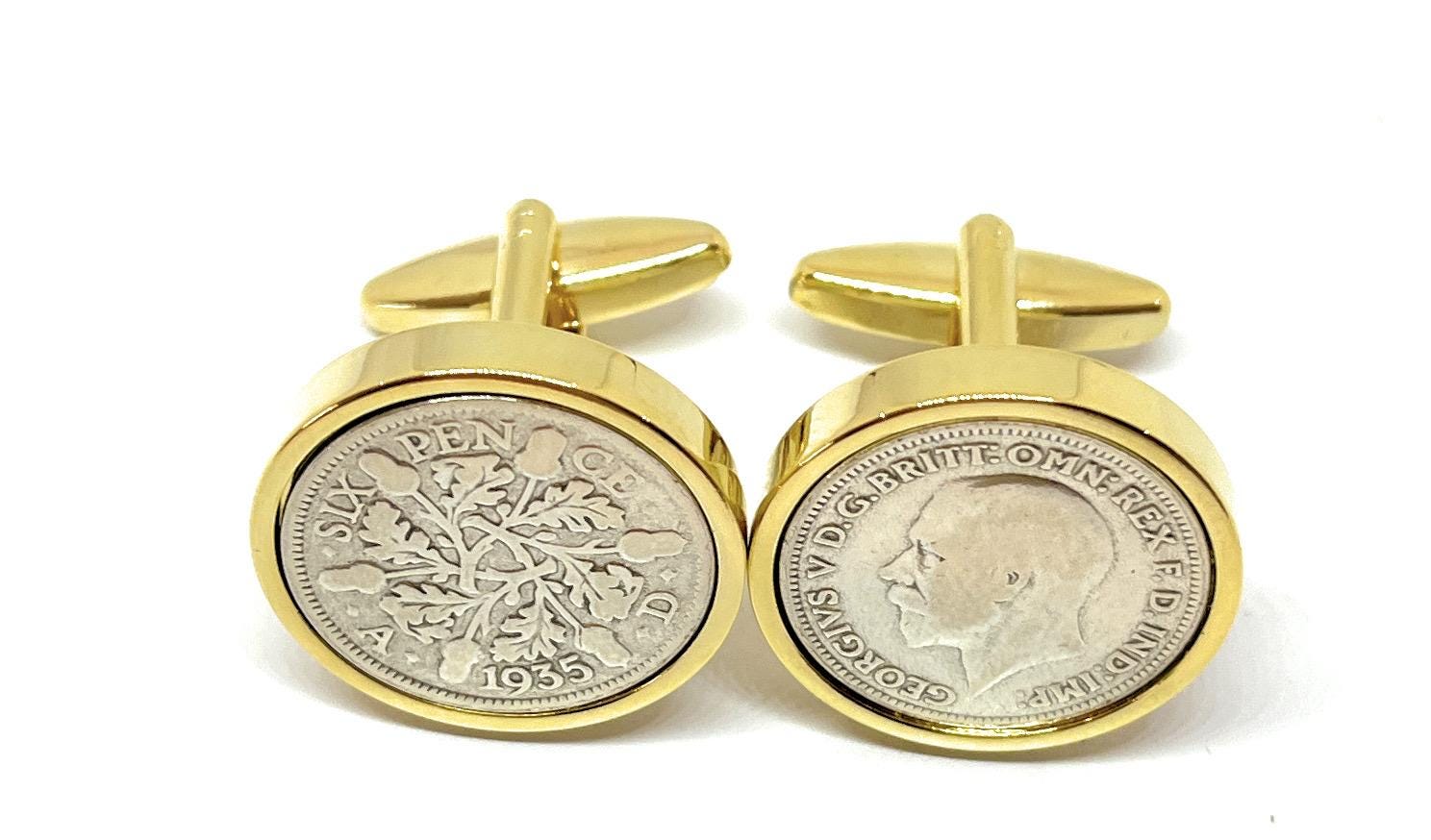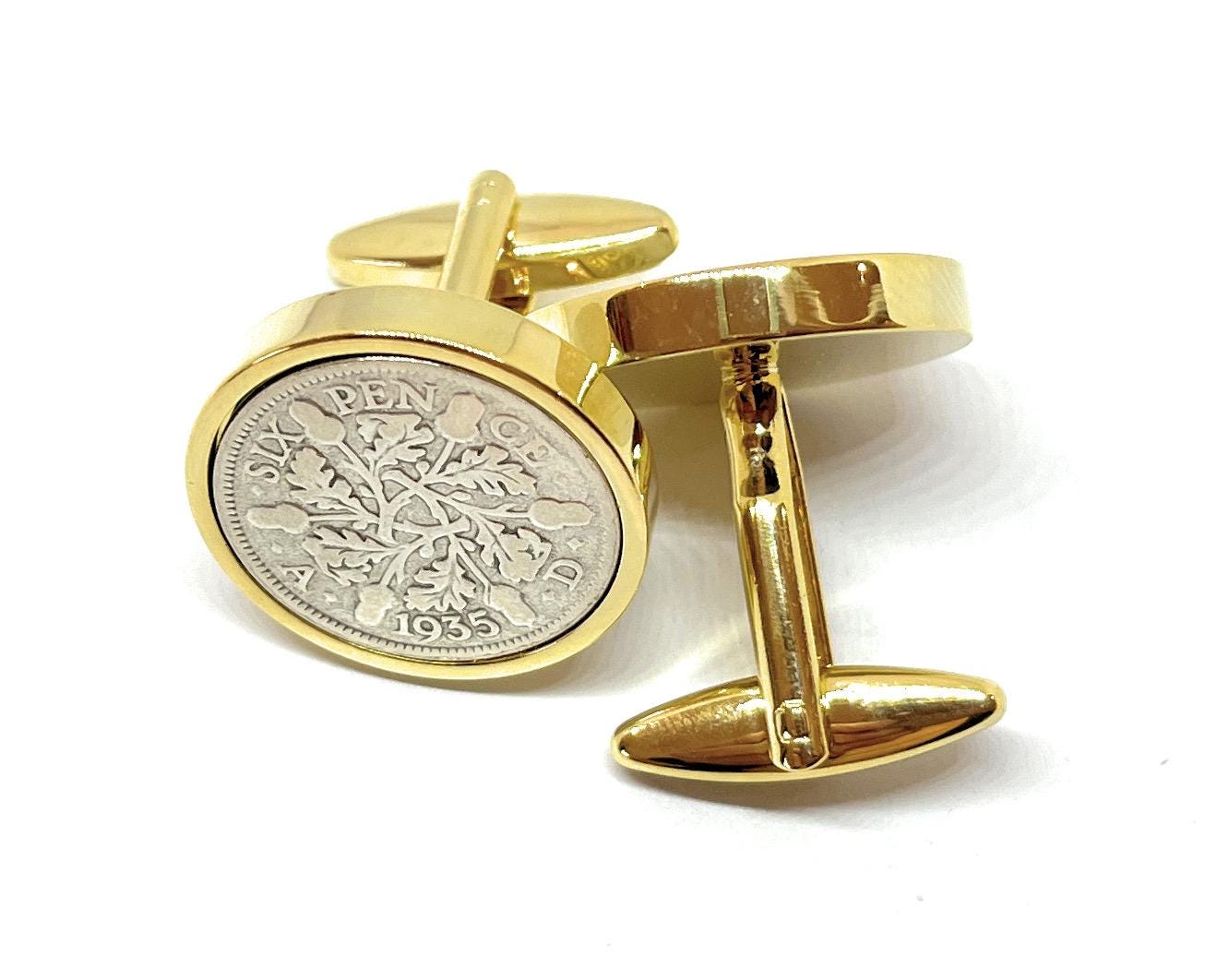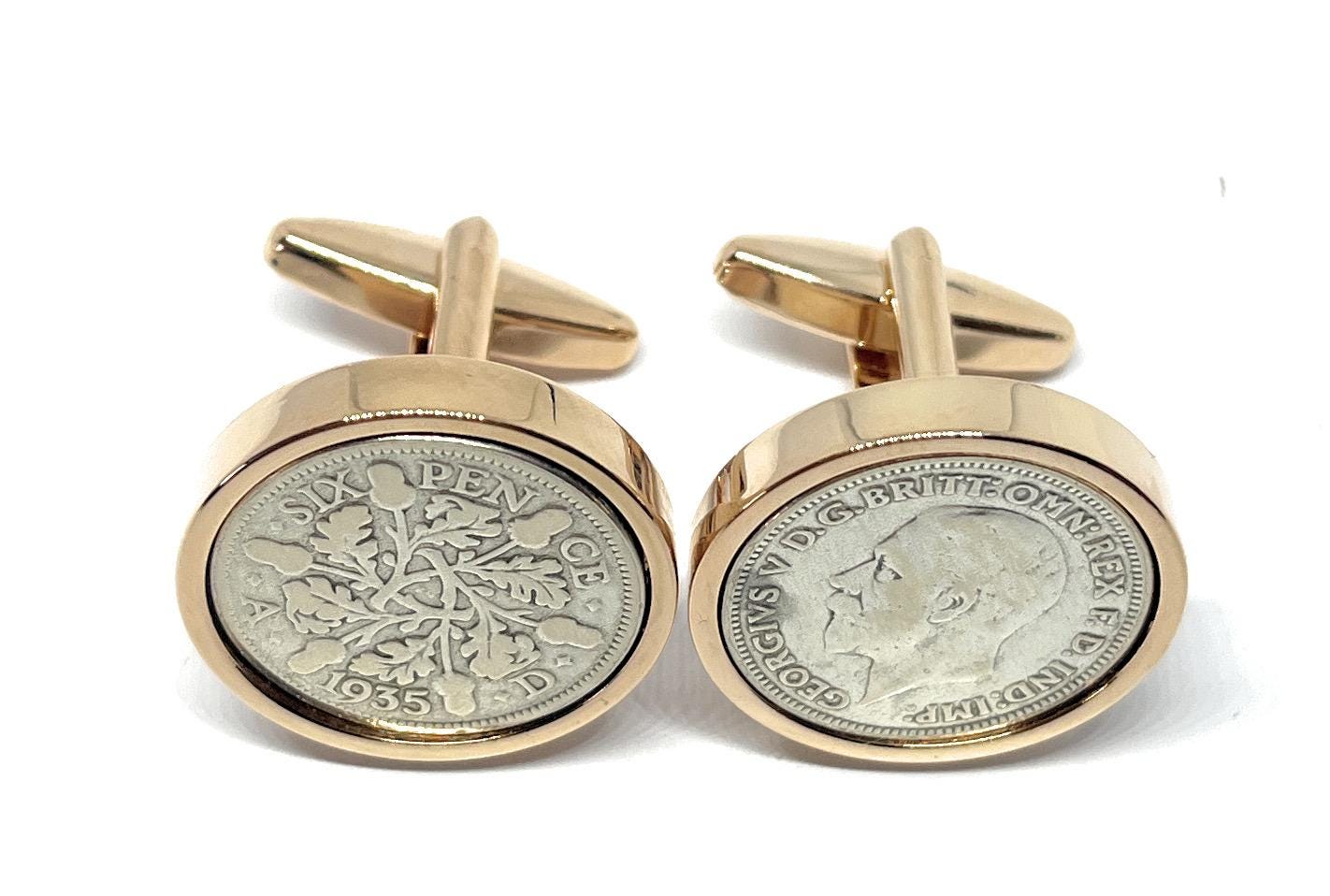 Genuine British Sixpence 6d coin cufflinks mounted in Silver, Gold or Rose Gold plated cufflink backs.