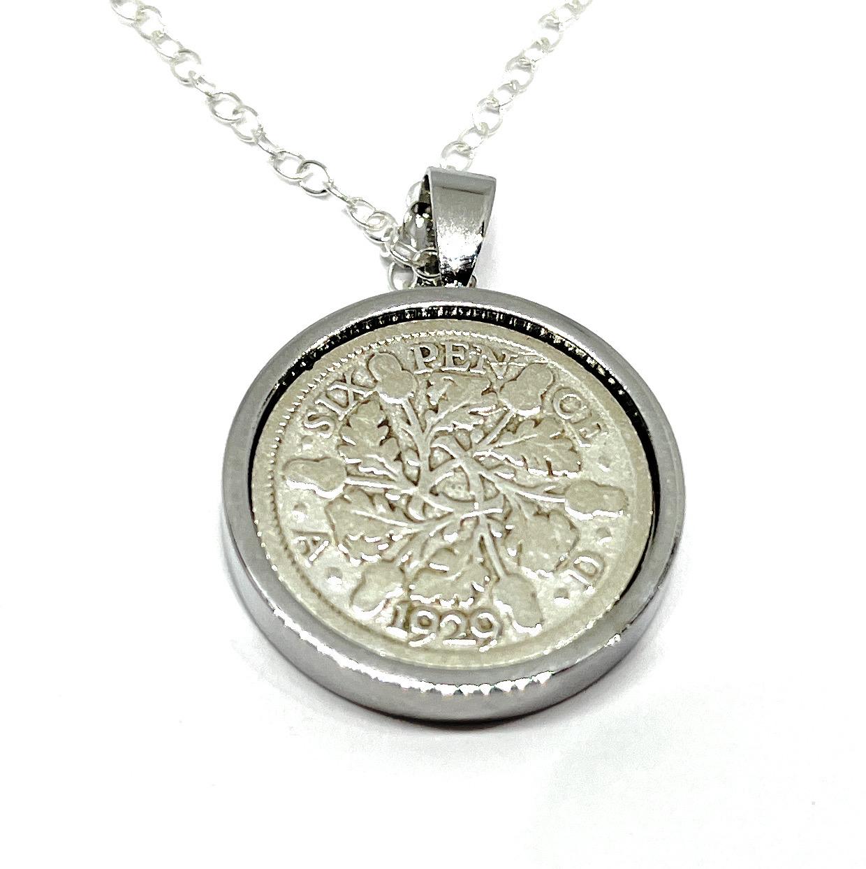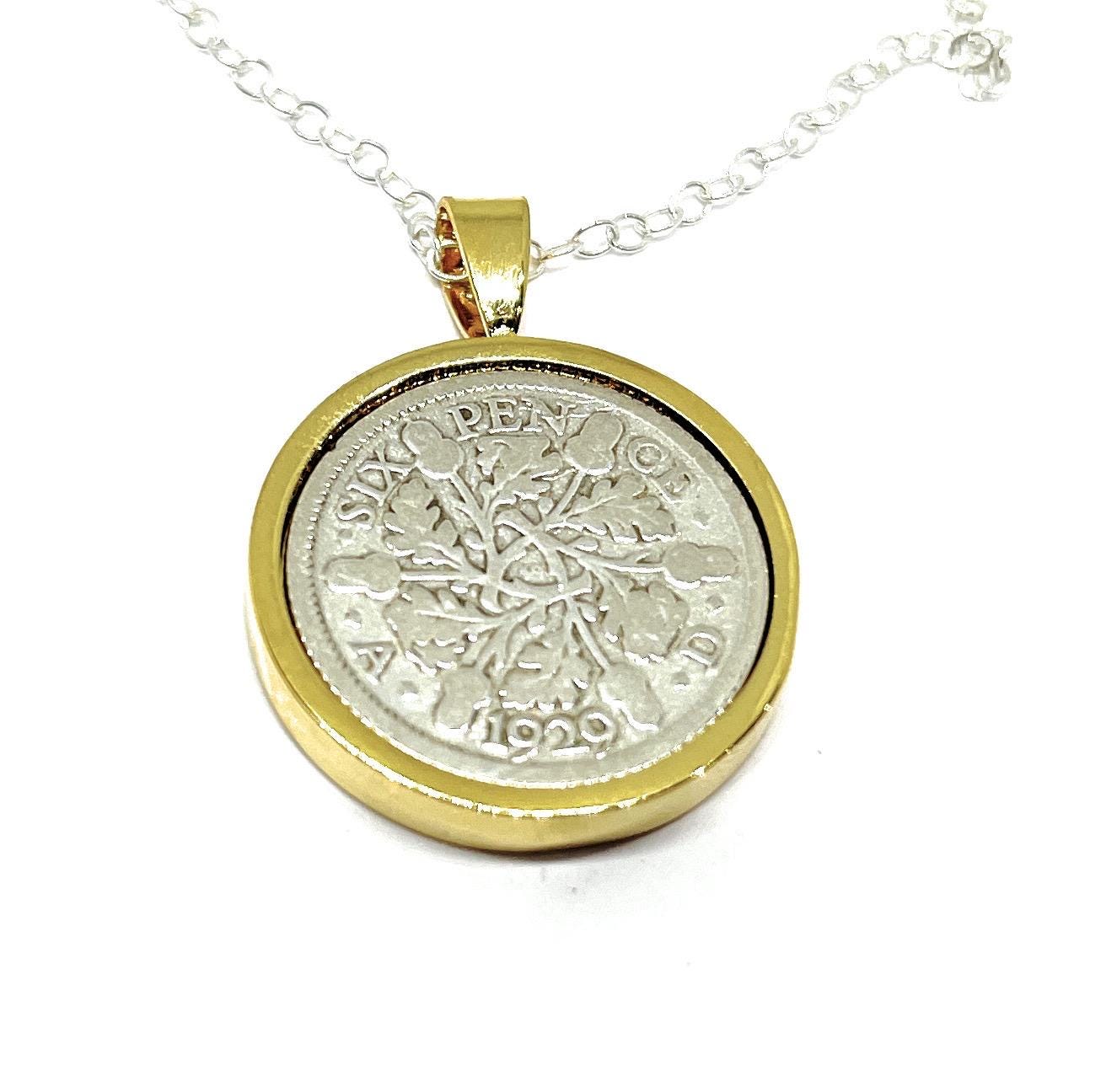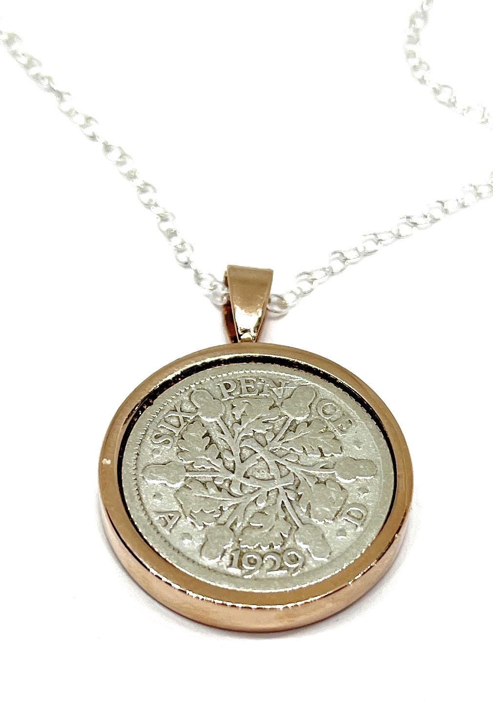 1929 Sixpence Coin Pendant: 96th Birthday Gift, Silver, Gold or RoseGold plated mounts