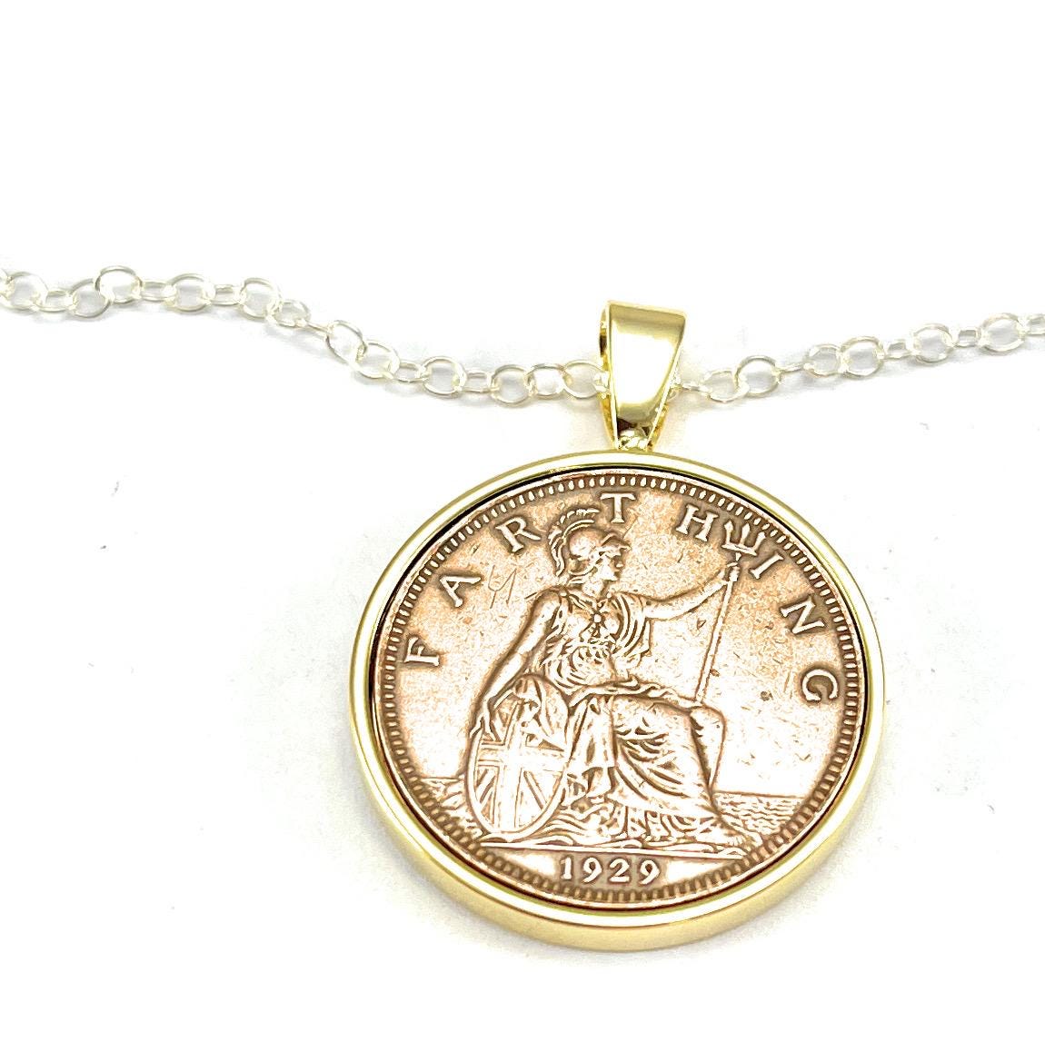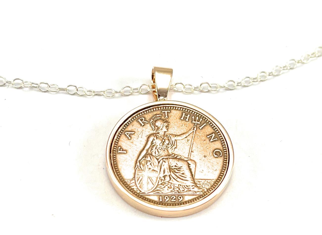 1929 Farthing Coin Pendant: 96th Birthday Gift, Silver, Gold or RoseGold plated mounts
