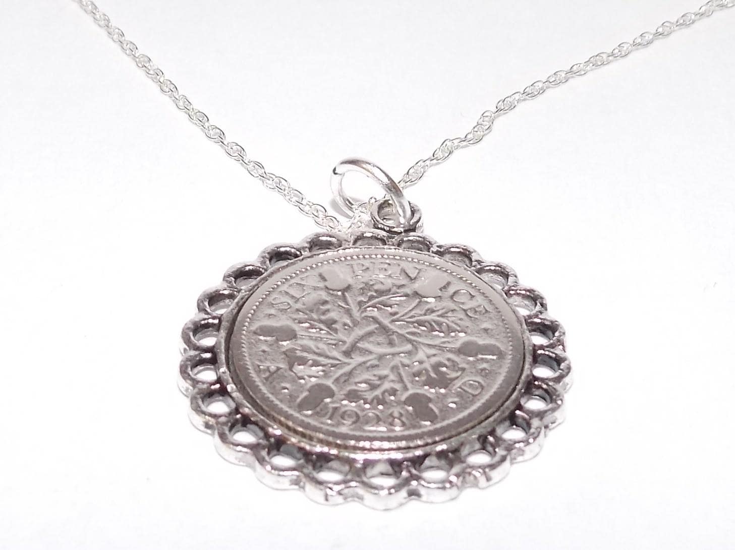 1928 97th Birthday gift Anniversary sixpence coin pendant: Sterling Silver chain