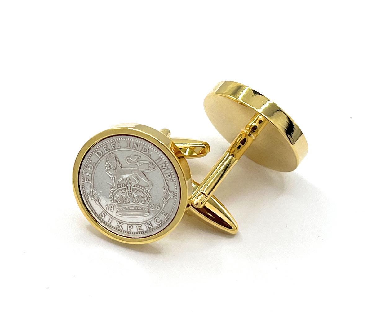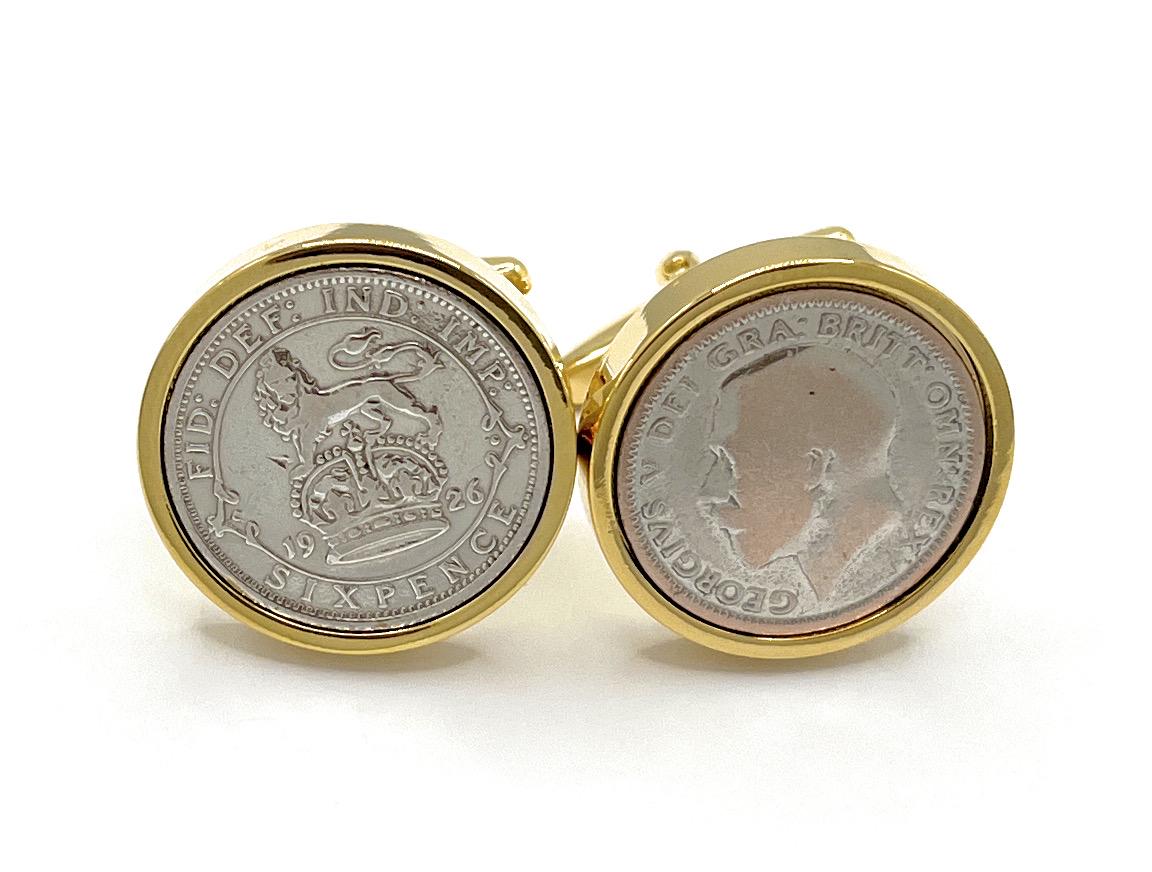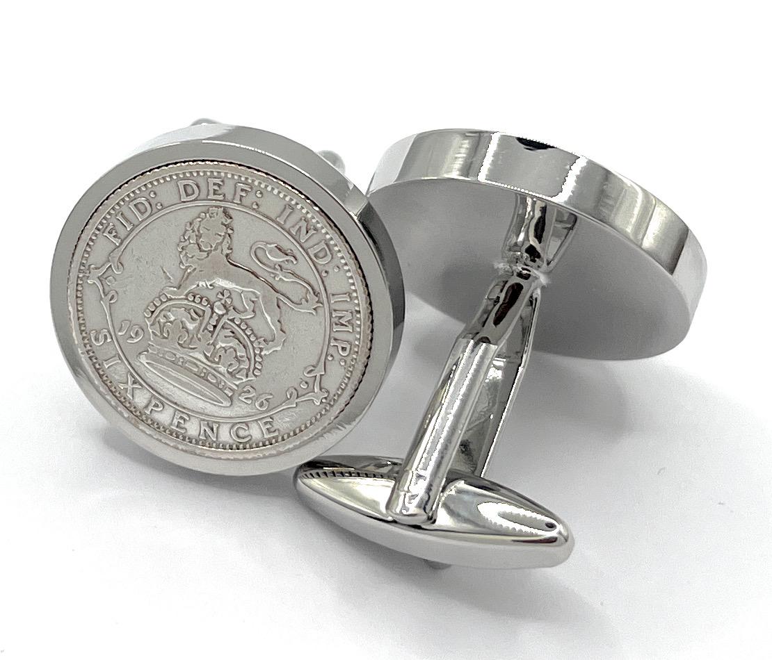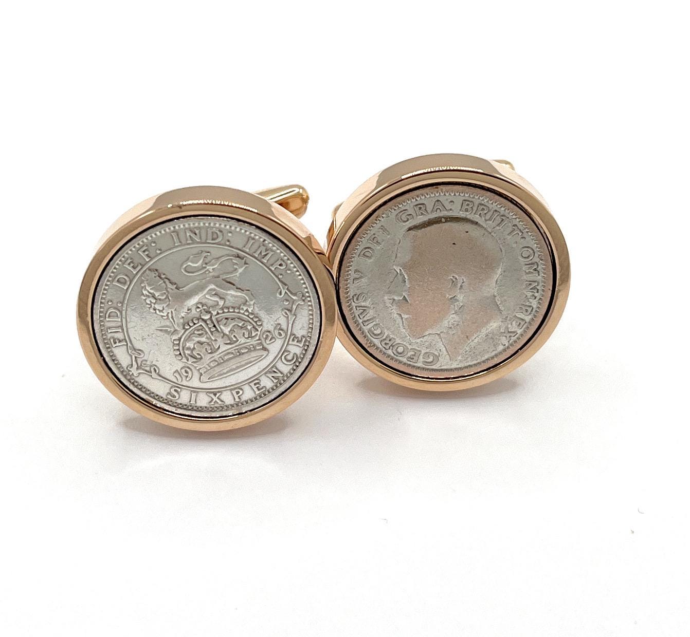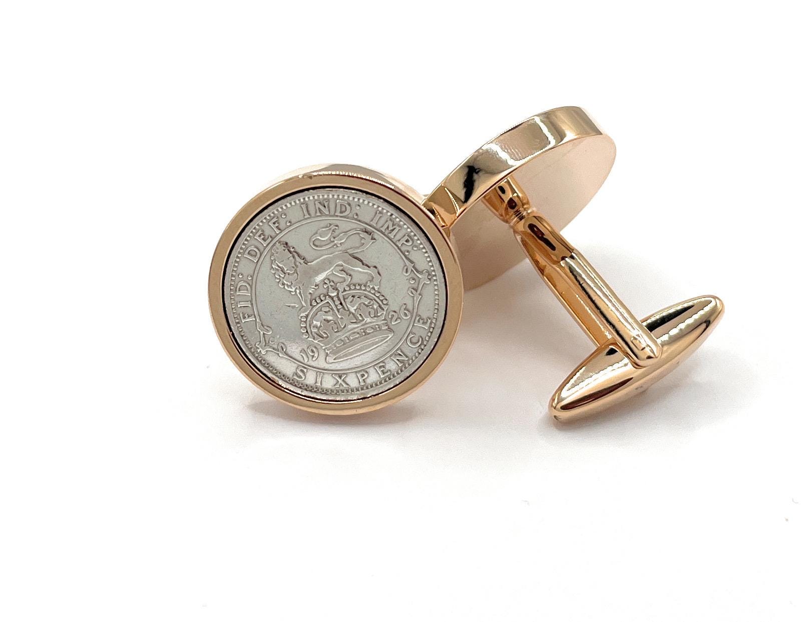 A Genuine pair of 1926 Circulated Sixpence coins cleaned and polished then inset into Silver, Gold or Rose Gold plated cufflinks.