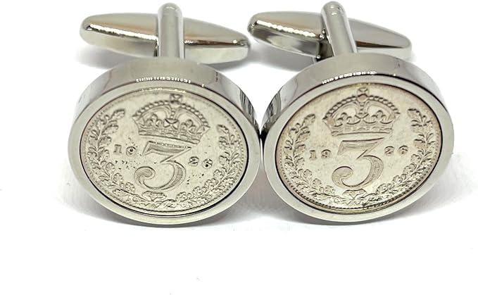 A Genuine pair of 1926 Circulated Silver Threepence coins cleaned and polished then inset into Silver plated cufflinks.