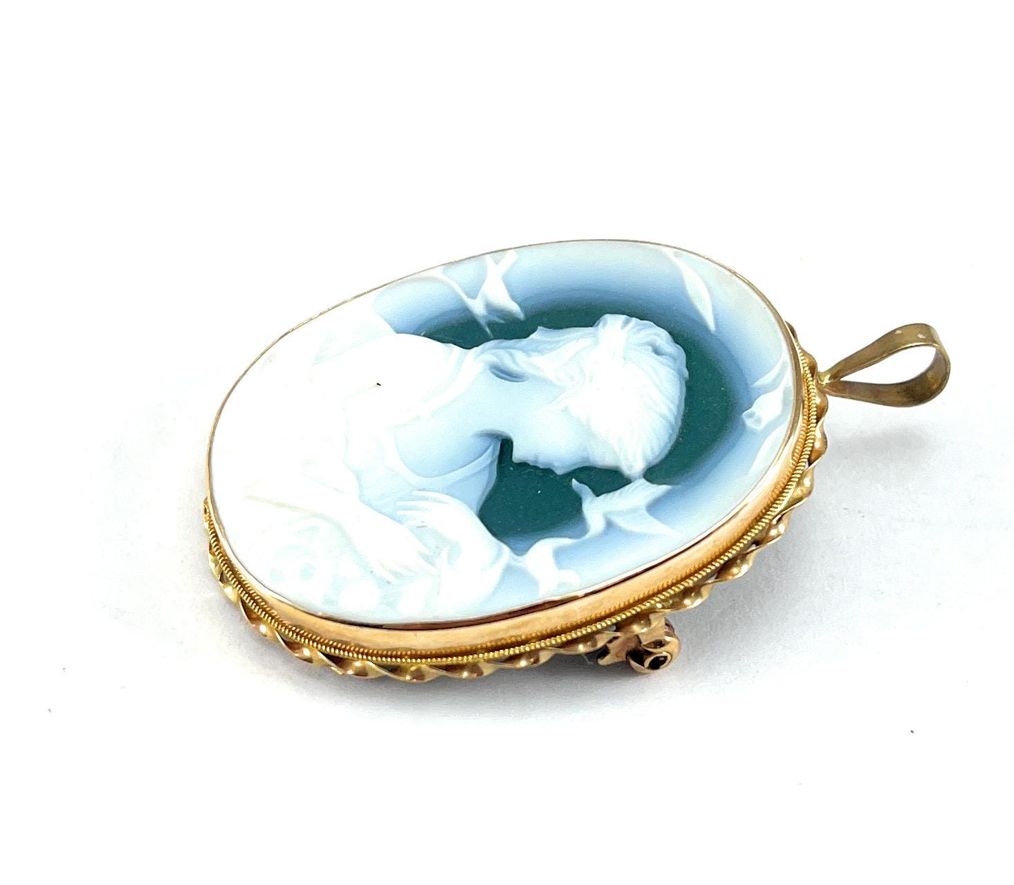 Introducing our exquisite Cameo Pendant / Brooch featuring a beautifully detailed Lady and doves scene—an elegant accessory that seamlessly combines vintage charm with timeless sophistication.