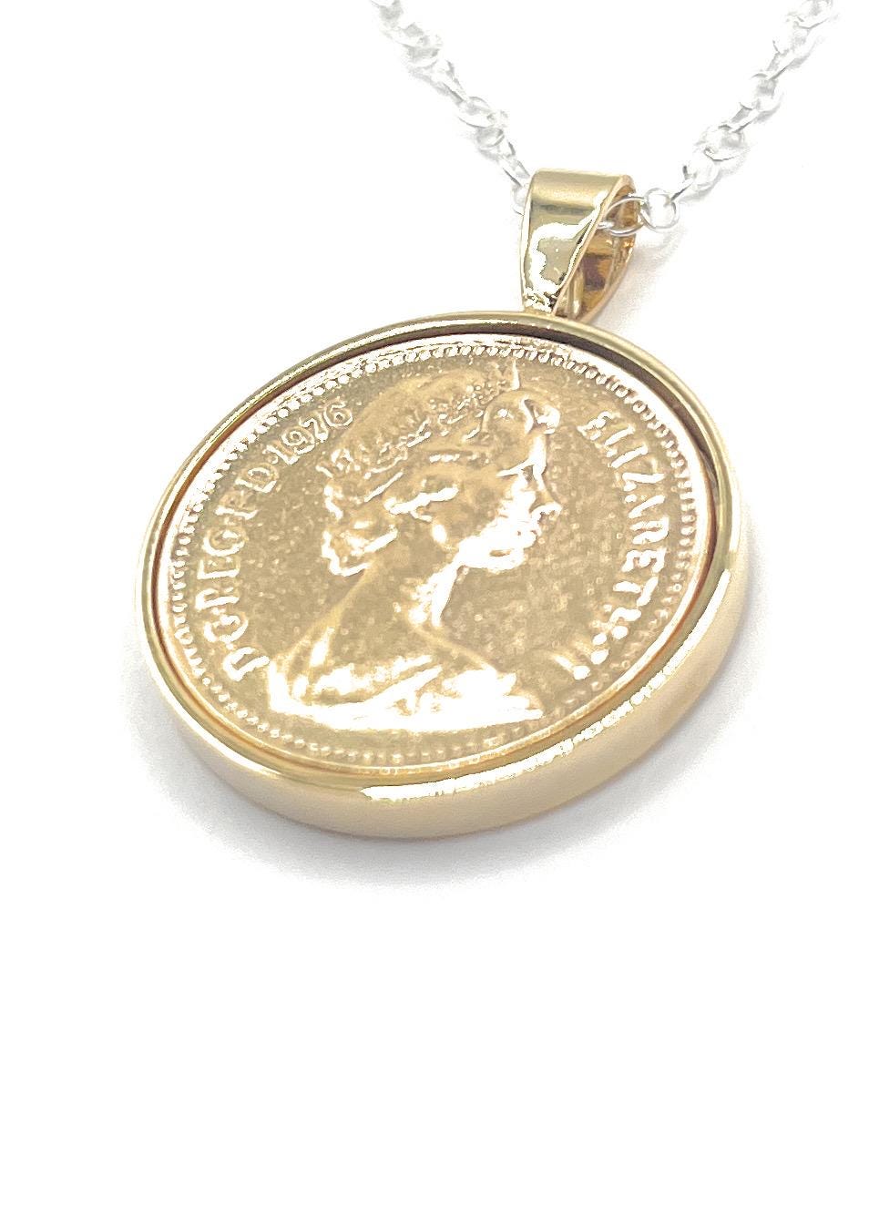 This 1976 Gold Plated One Pence Coin Pendant are a unique and timeless gift, perfect for celebrating a 49th birthday. Featuring the distinctive design of a British Gold Plated one penny from the year of birth, this Pendant offer a meaningful connection to the past while adding a sophisticated touch to any outfit.