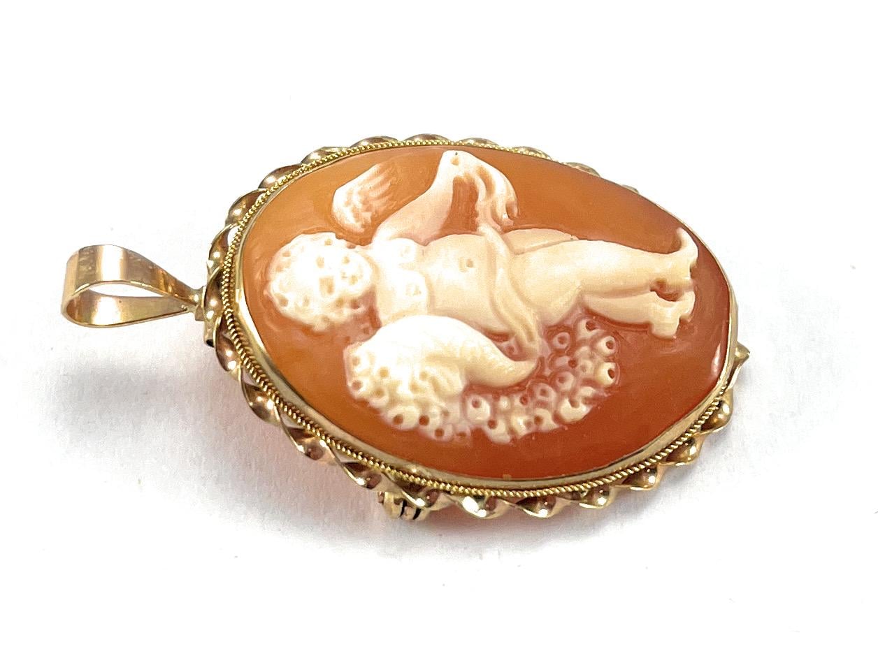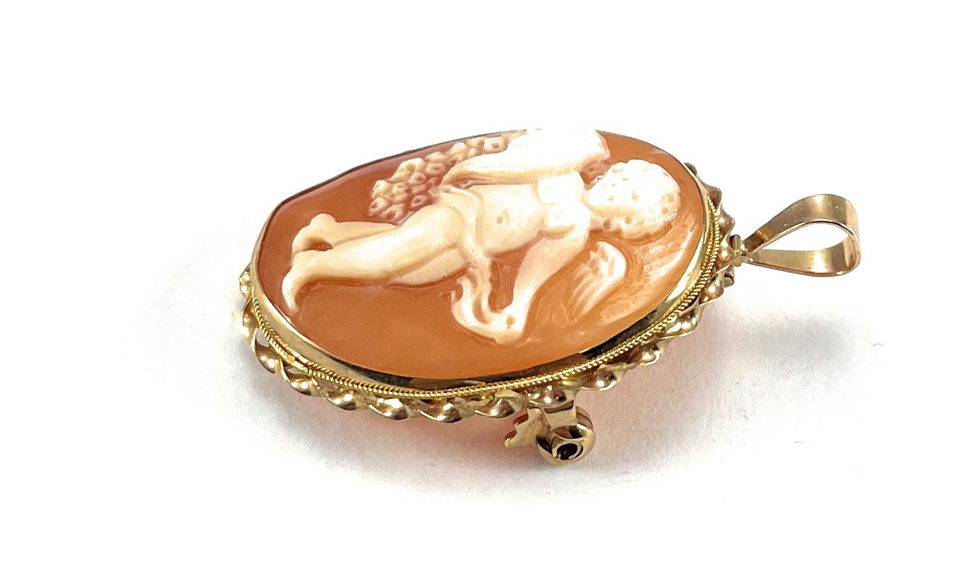 Introducing our exquisite Cameo Pendant / Brooch featuring a beautifully detailed Dancing Cherub—an elegant accessory that seamlessly combines vintage charm with timeless sophistication.
