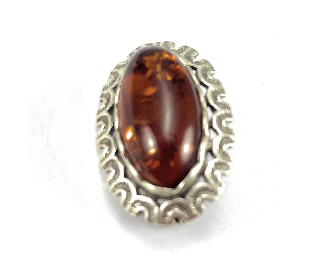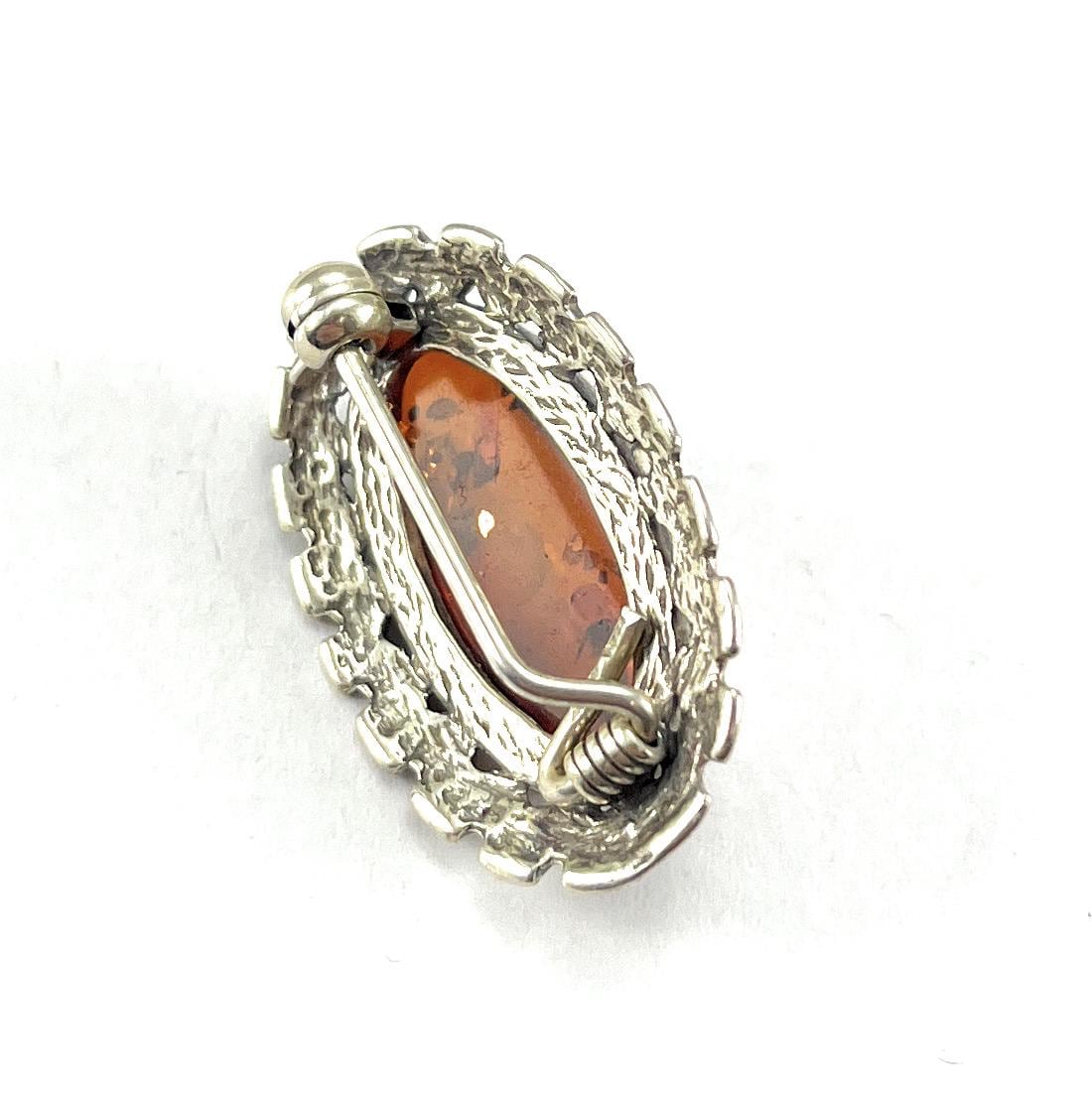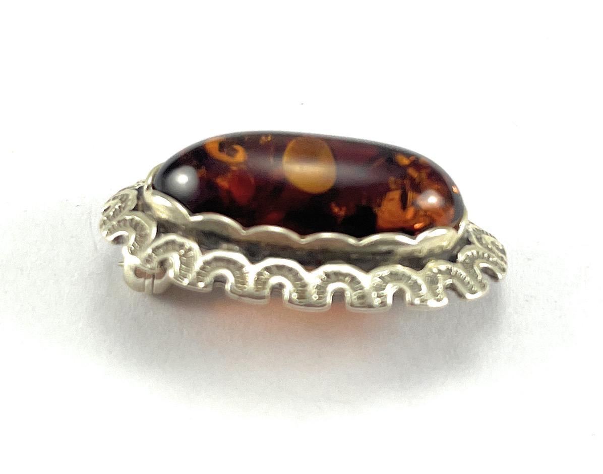 This exquisite Amber Brooch is a stunning piece crafted from antique sterling silver, beautifully accented with warm amber. Measuring approximately 2.6 cm by 1.8 cm, this delicate brooch showcases exceptional craftsmanship and intricate design that captures the charm of vintage jewelry. The amber’s rich, golden hues complement the cool sheen of the silver, making it a striking accessory for any outfit.
