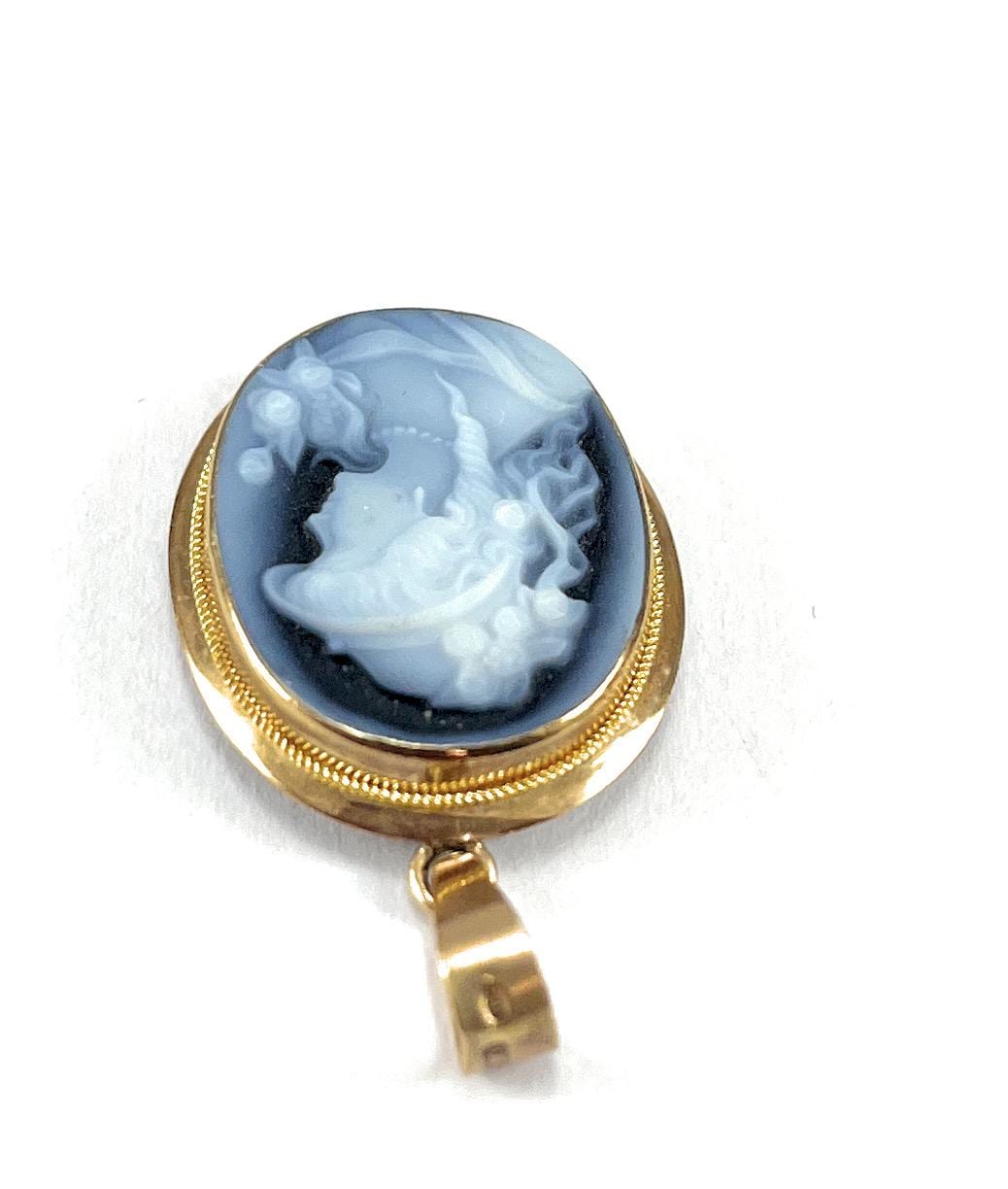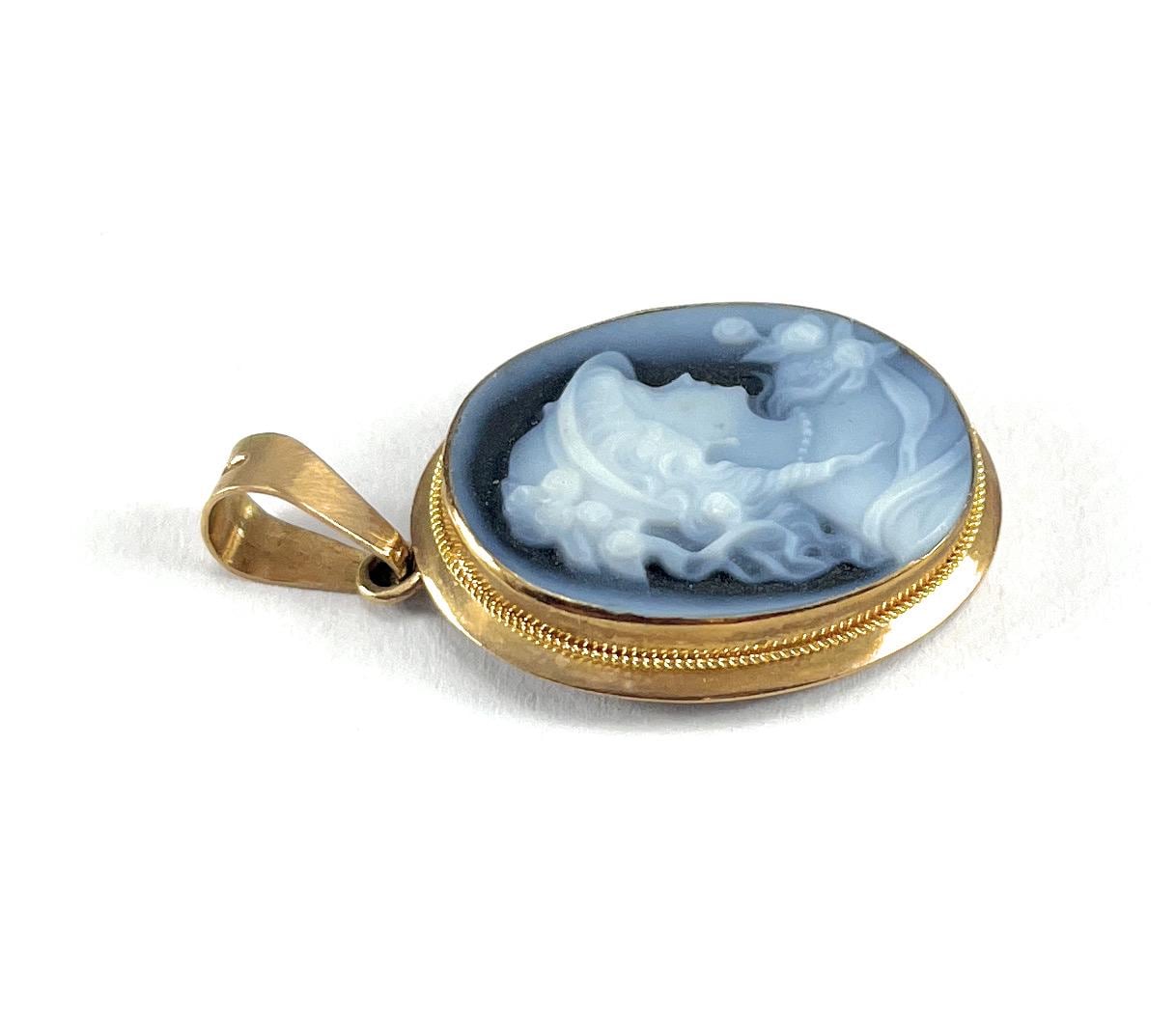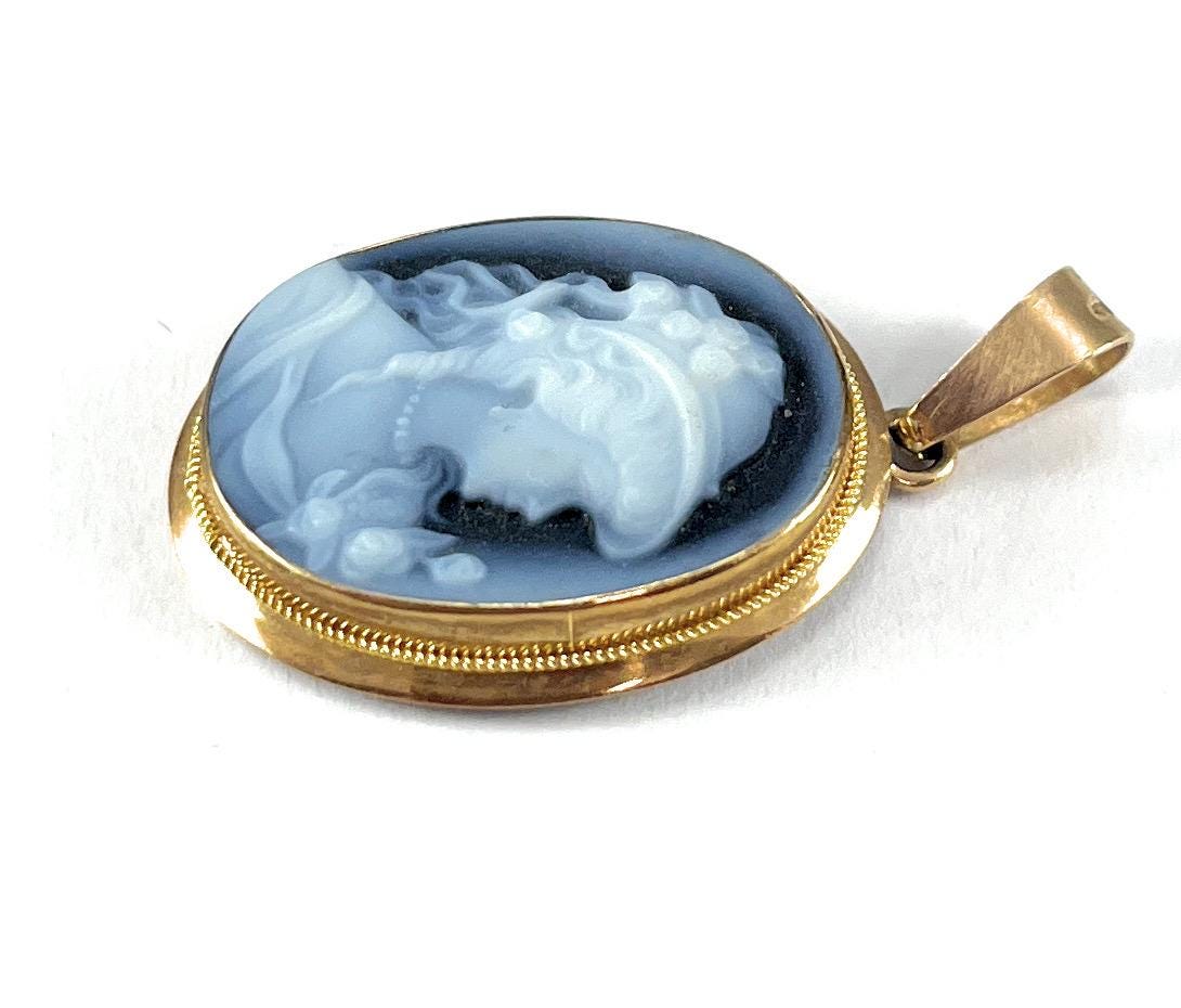 The cameo is carved from agate and set within a delicate oval 9ct gold frame, creating a stunning contrast that highlights the intricate detail of the carving.