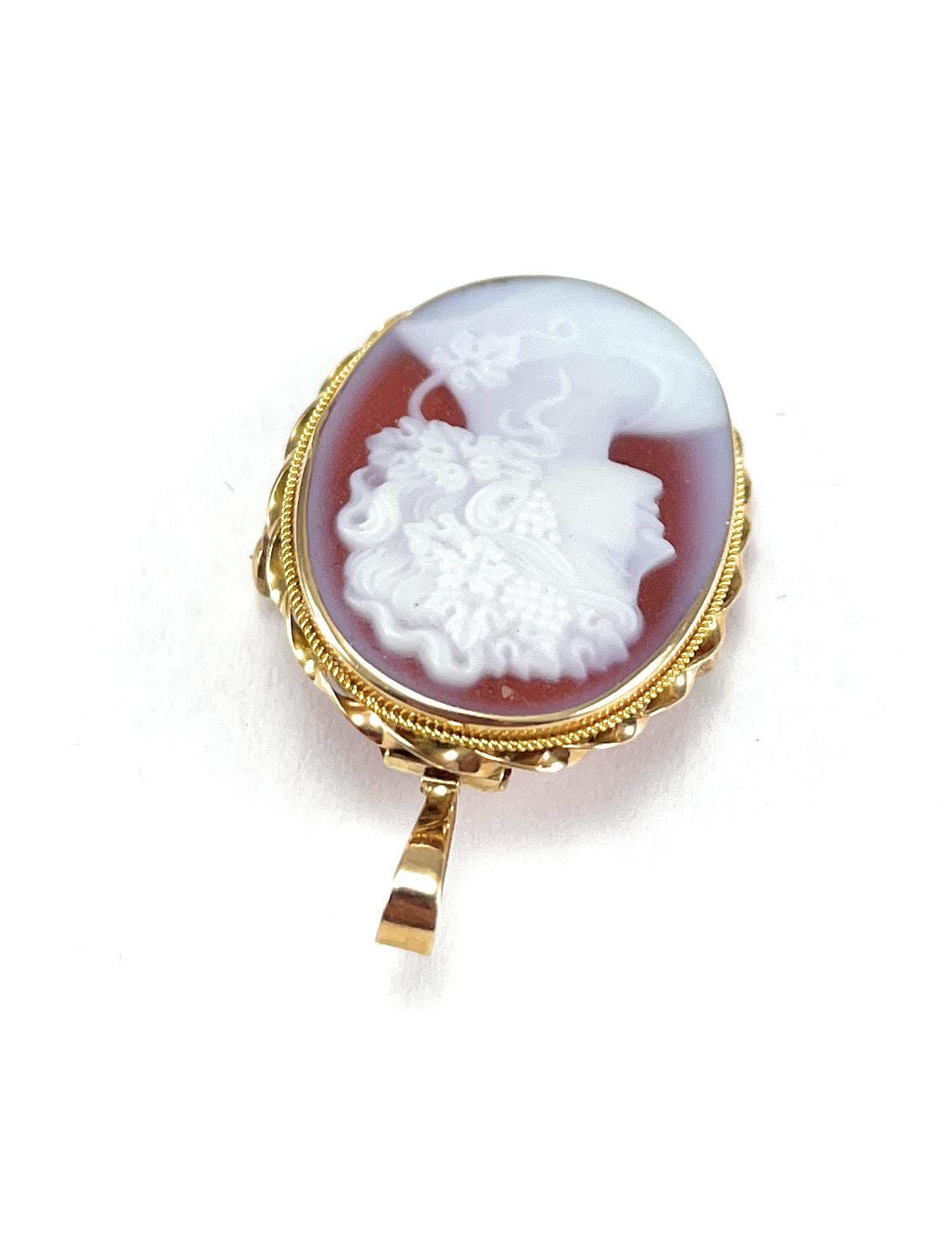 The cameo is carved from agate and set within a delicate oval 9ct gold frame, creating a stunning contrast that highlights the intricate detail of the carving.