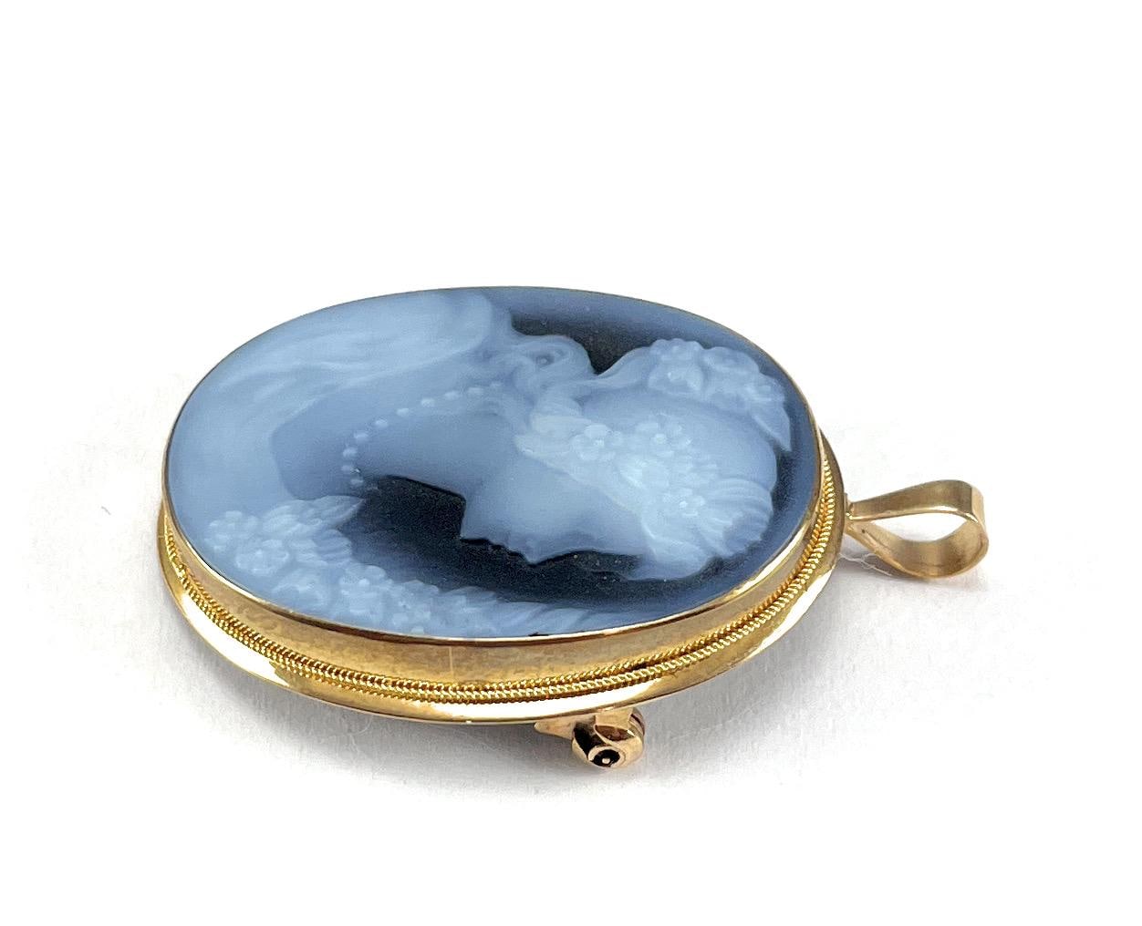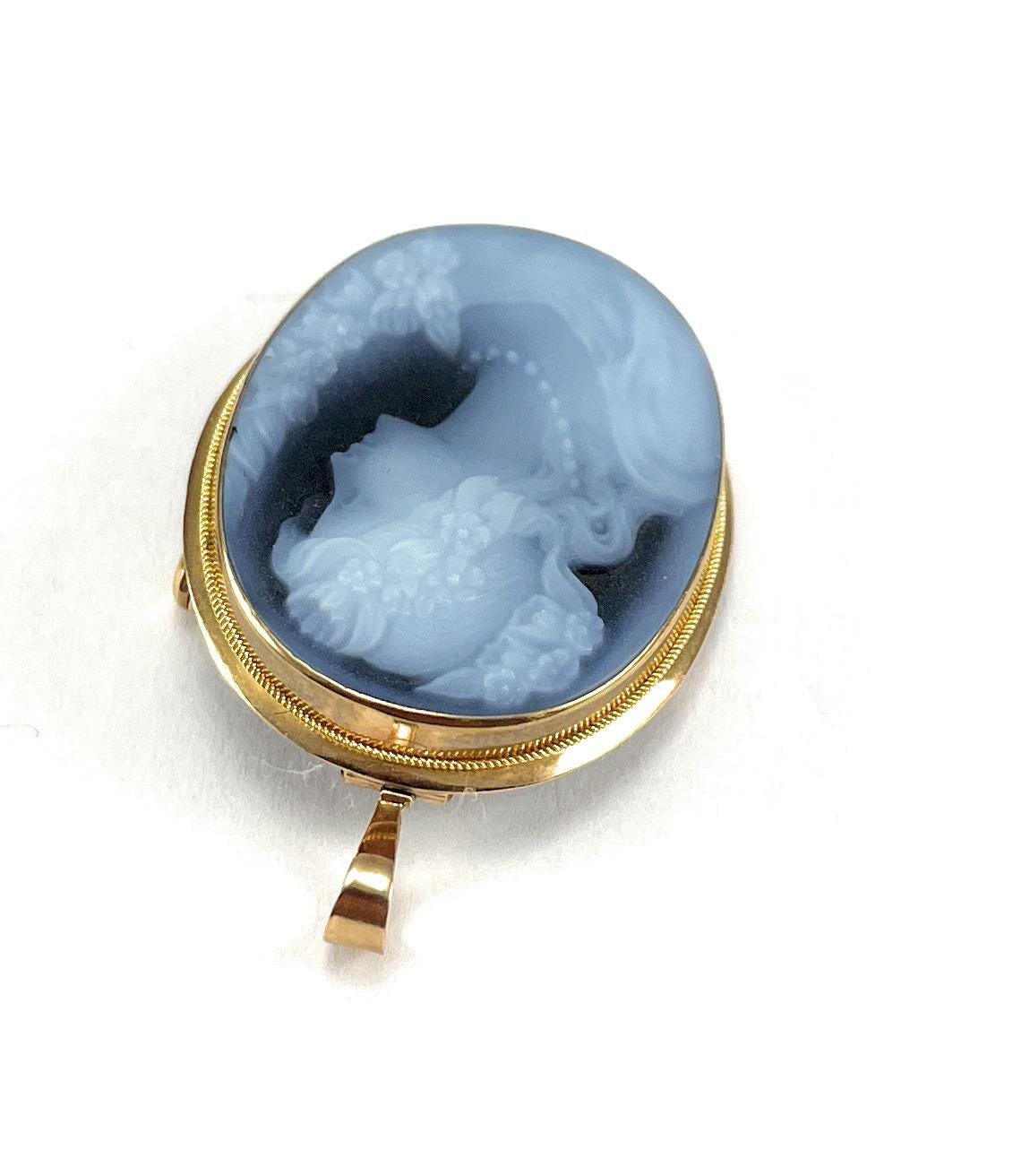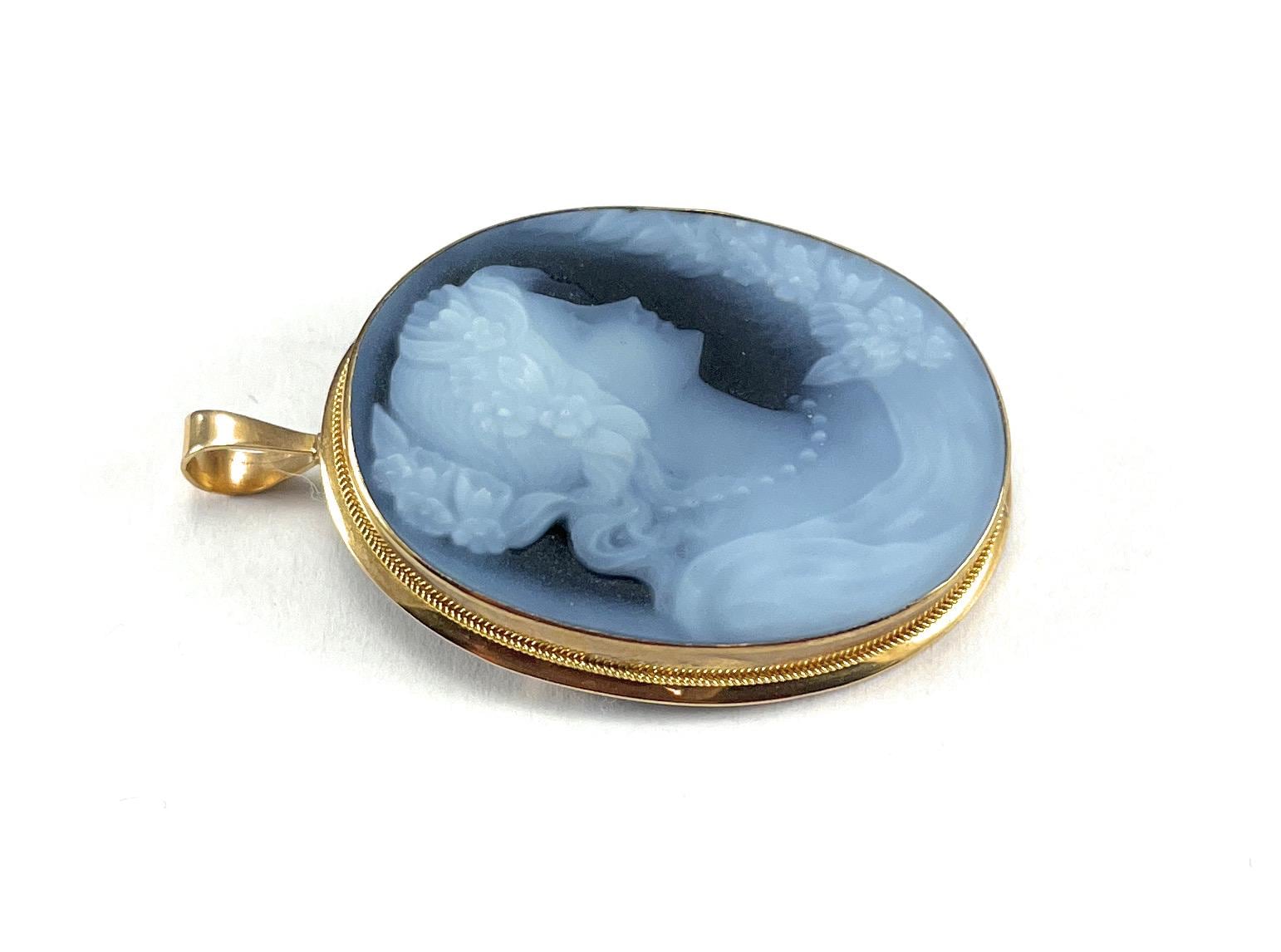 The cameo is carved from agate and set within a delicate oval 9ct gold frame, creating a stunning contrast that highlights the intricate detail of the carving.