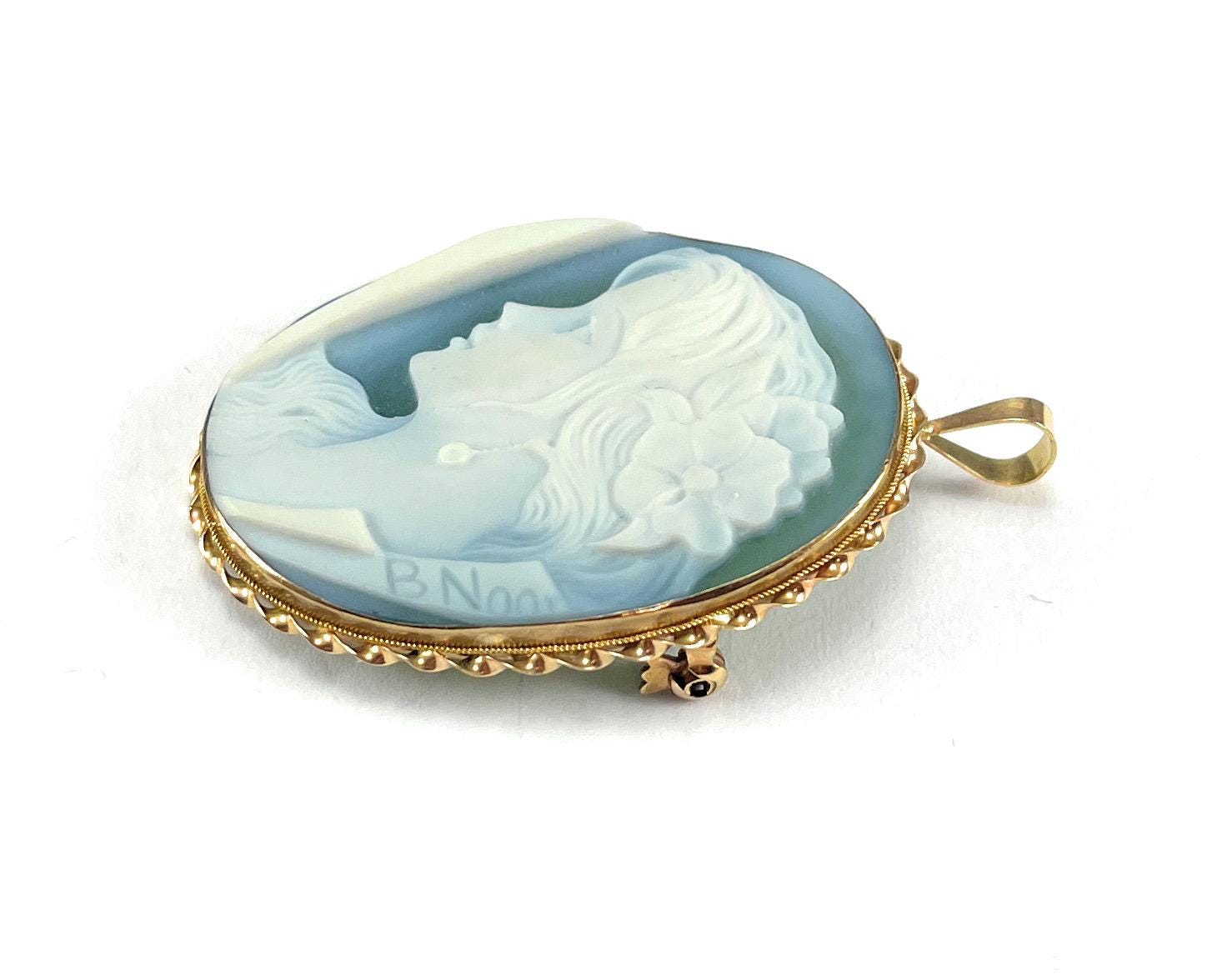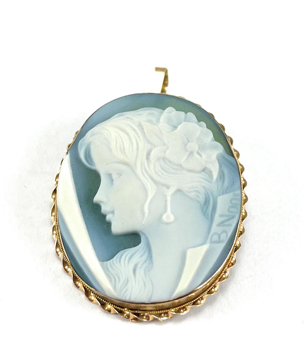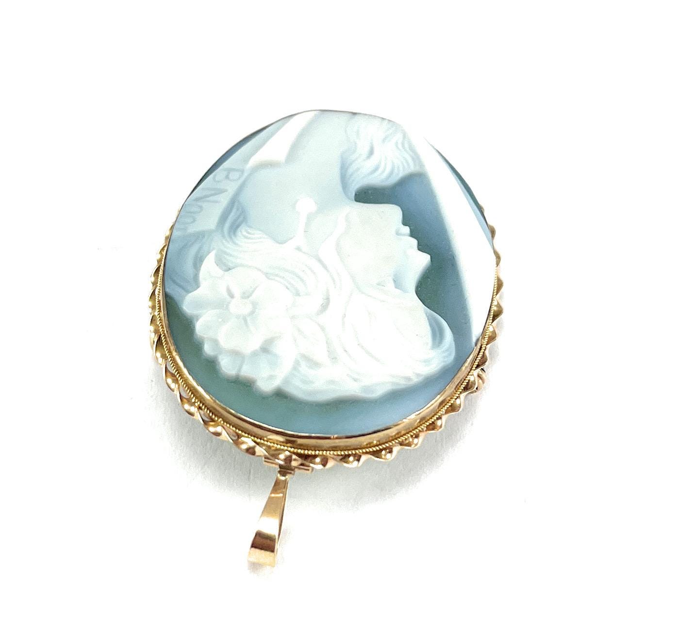 The cameo is carved from a cream-coloured shell agate and set within a delicate oval 9ct gold frame, creating a stunning contrast that highlights the intricate detail of the carving.
