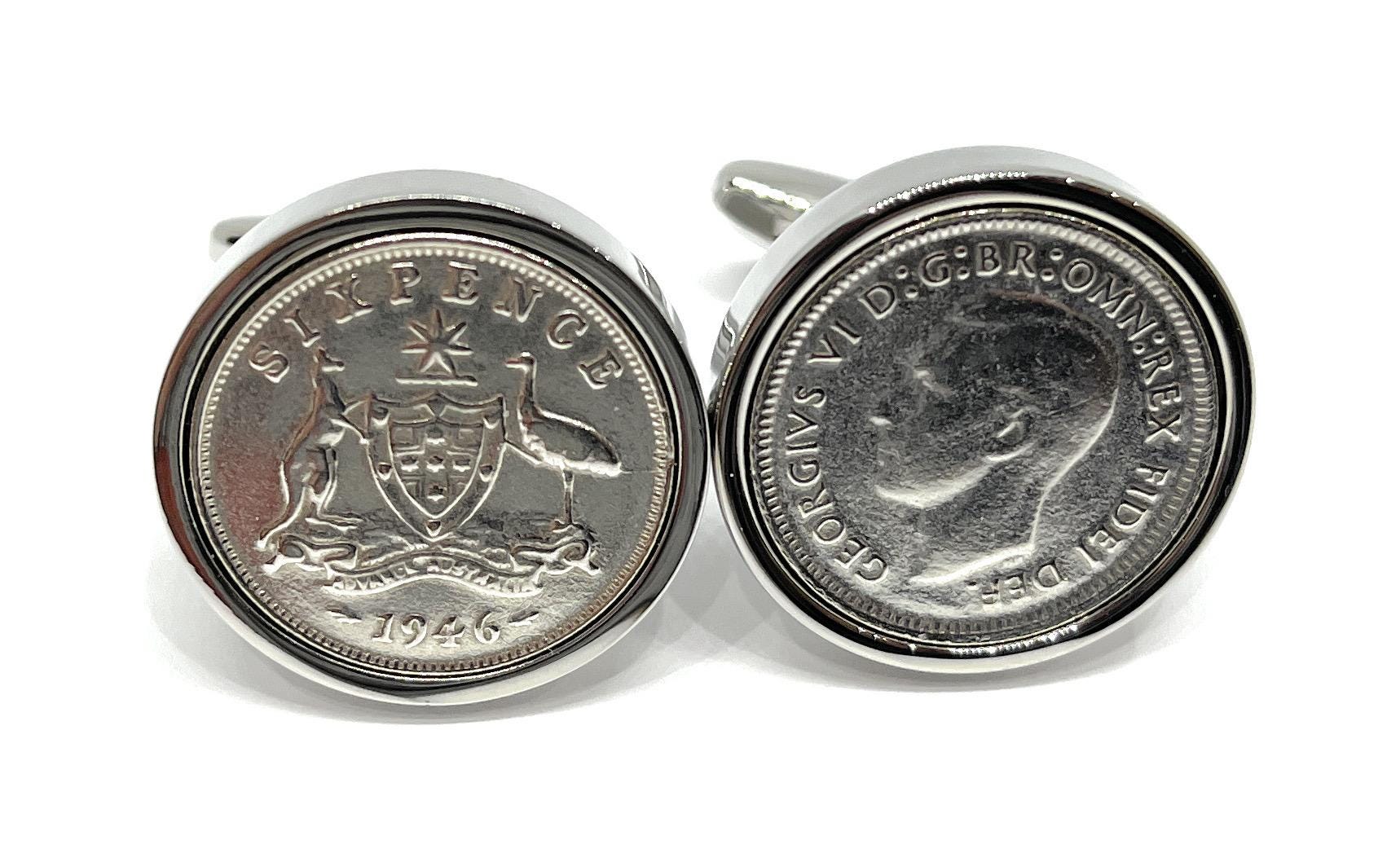 1946 Australian Sixpence Coin Cufflinks 79th Birthday Gift: Silver Plated Mounts