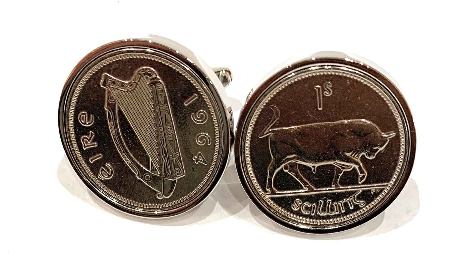 - Genuine 1964 Irish Shilling coins with embossed Bull & Harp symbol