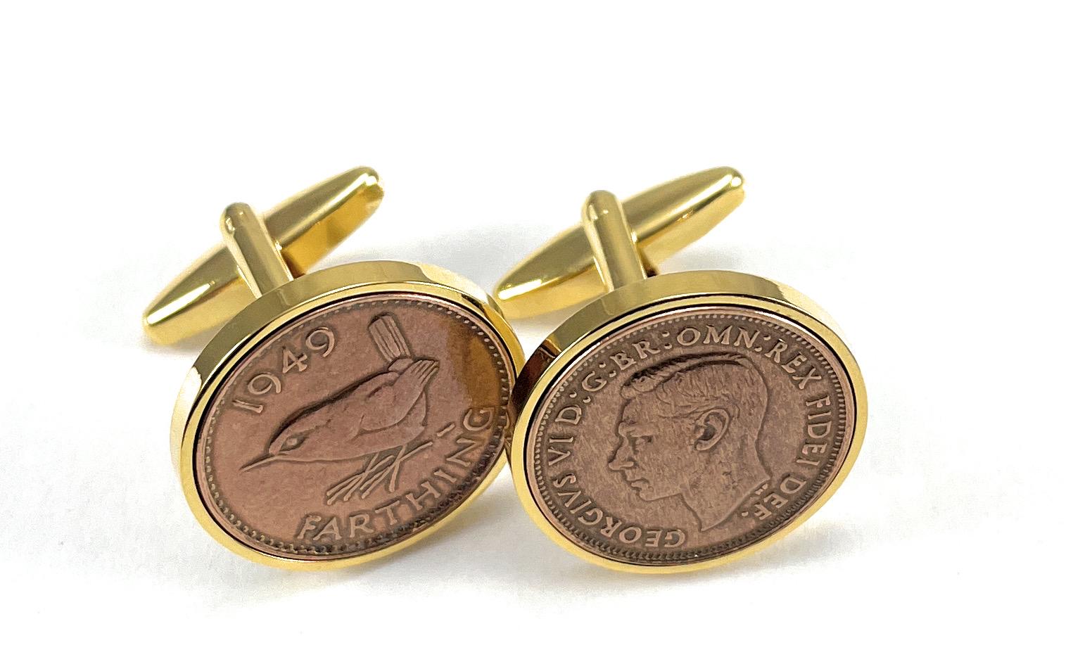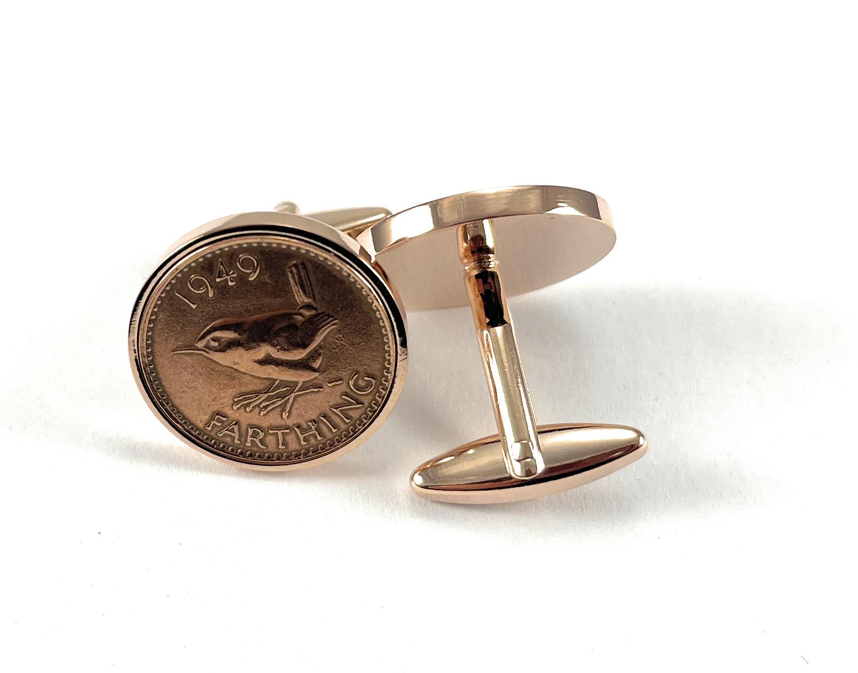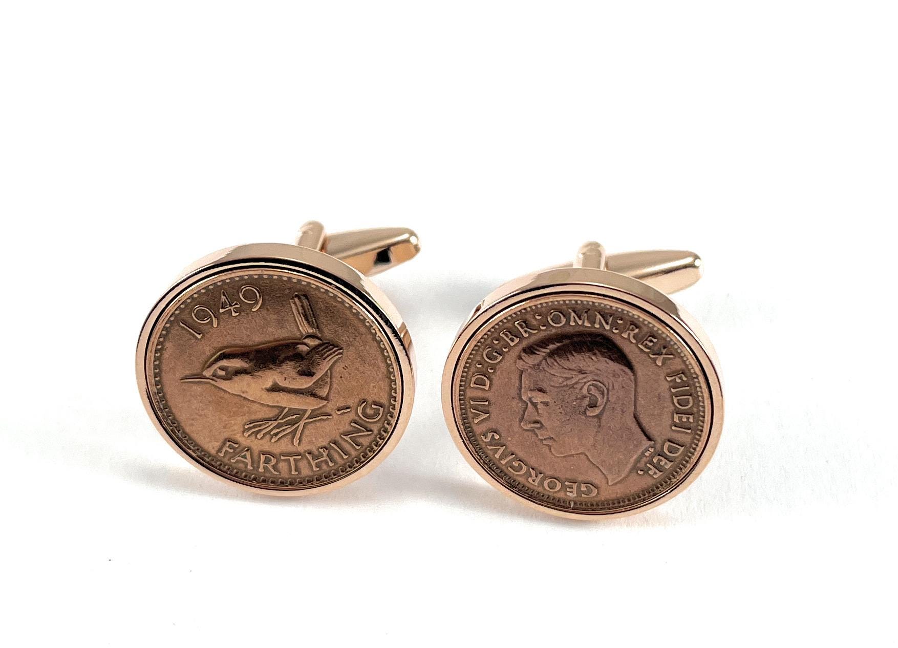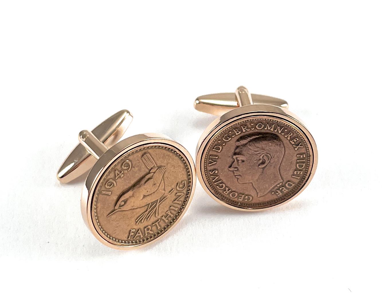 76th Birthday gift 1949 Farthing Coin Cufflinks: Silver, Gold or RoseGold Pated Mounts