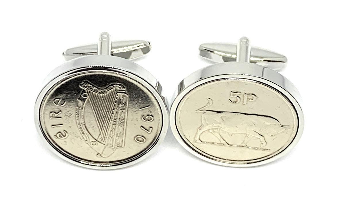 1970 55th Birthday gift Old Large Irish 5p coin cufflinks 23mm: Silver Or Gold Plated Mounts