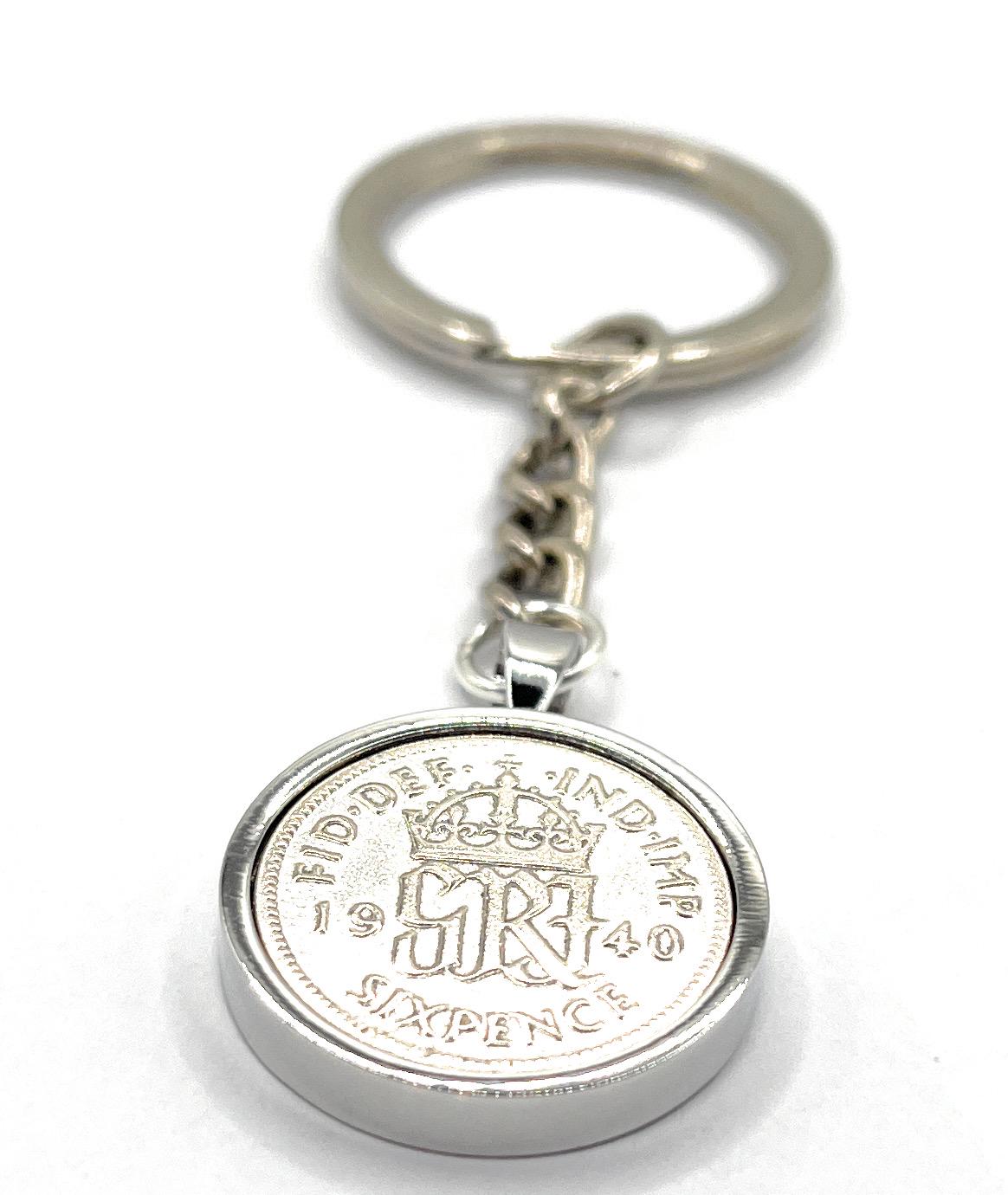 1940 Sixpence Coin Keyring 85th Birthday Gift: Silver, Gold or RoseGold Plated Mounts