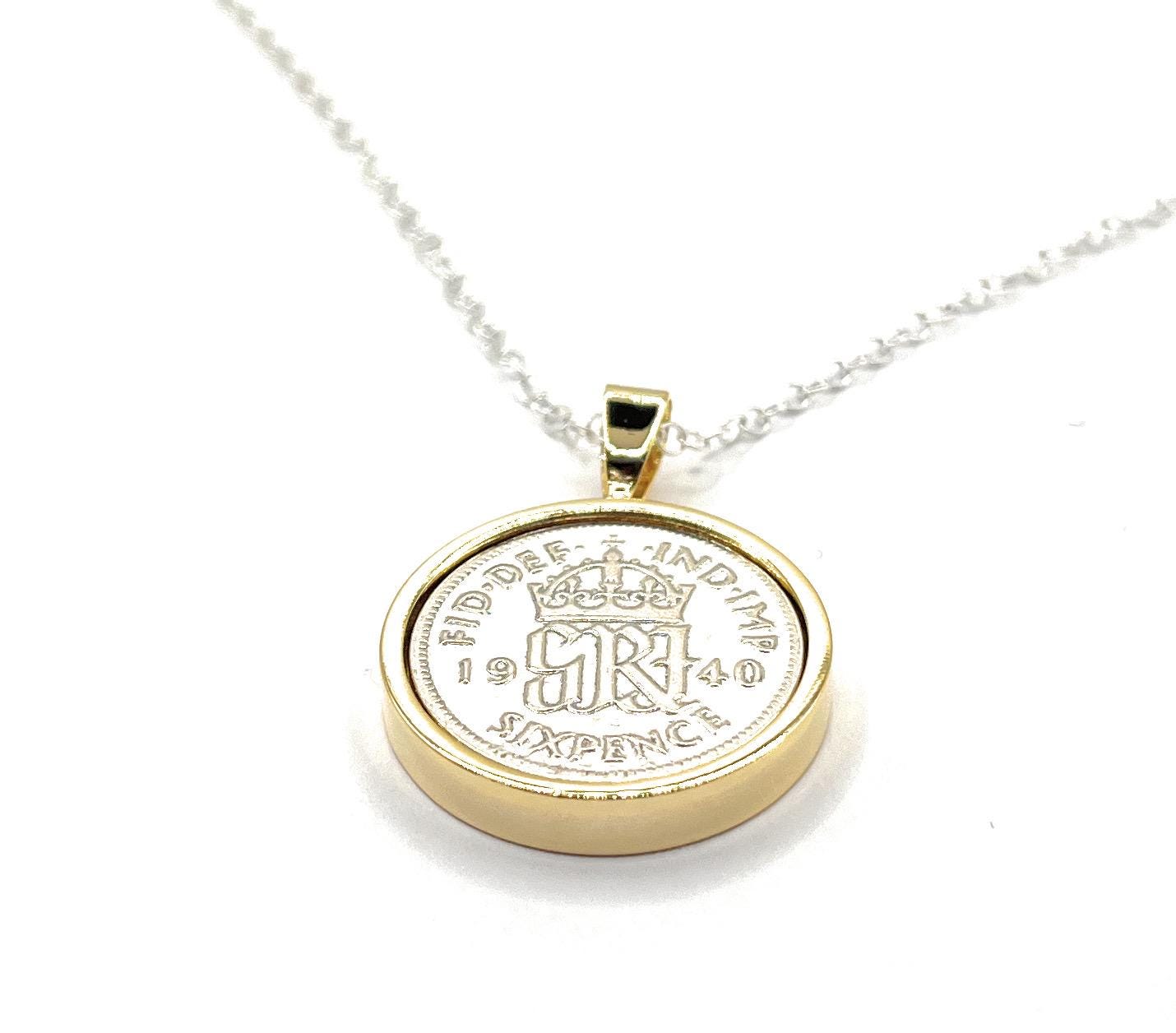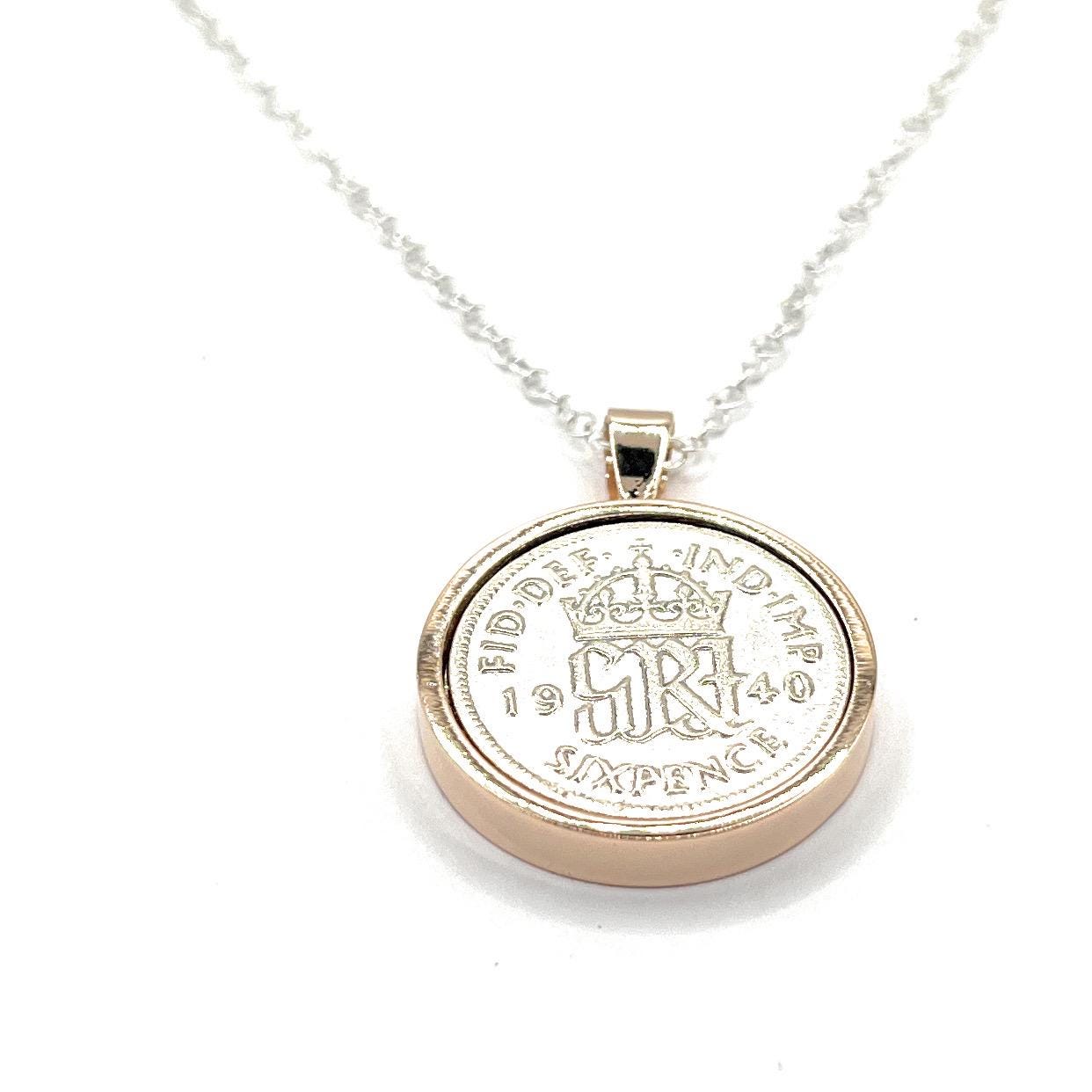 Genuine Circulated Sixpence Mounted on a Silver, Gold or Rose Gold Pkated mount with a Sterling silver chain and a cleaned and polished 1940 sixpence coin