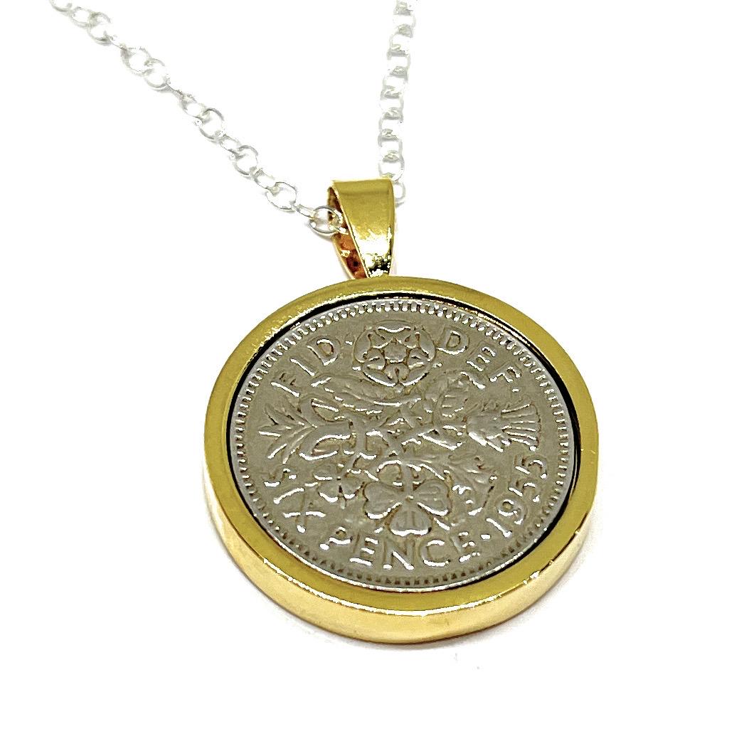 1955 70th Birthday Gift Sixpence Pendant: Silver, Gold or Rose Gold Plated mounts