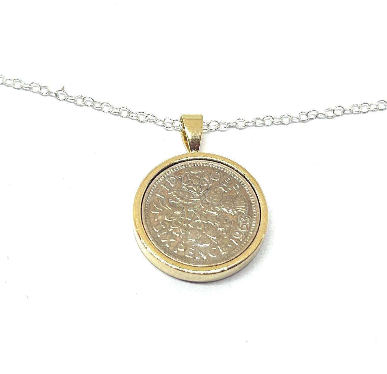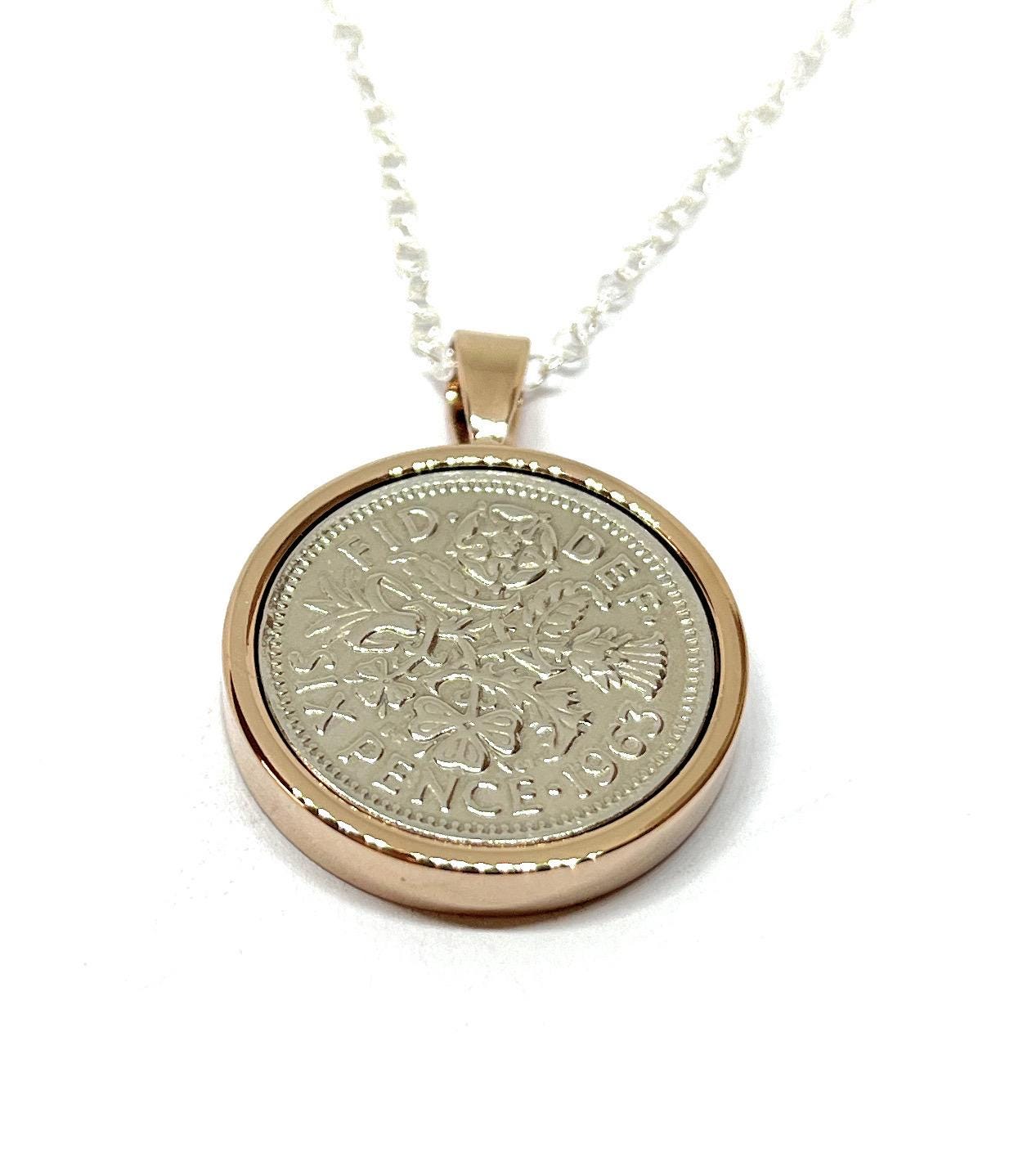 1963 62nd Birthday Gift Sixpence Necklace: Silver, Gold or RoseGold Plated mounts