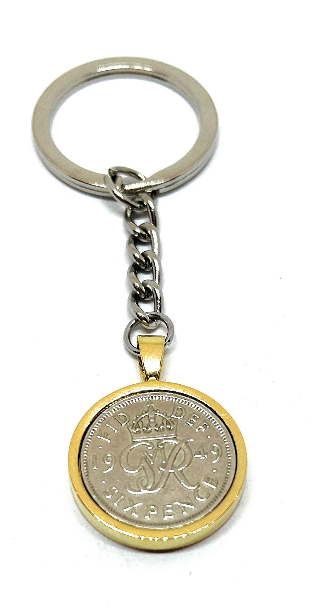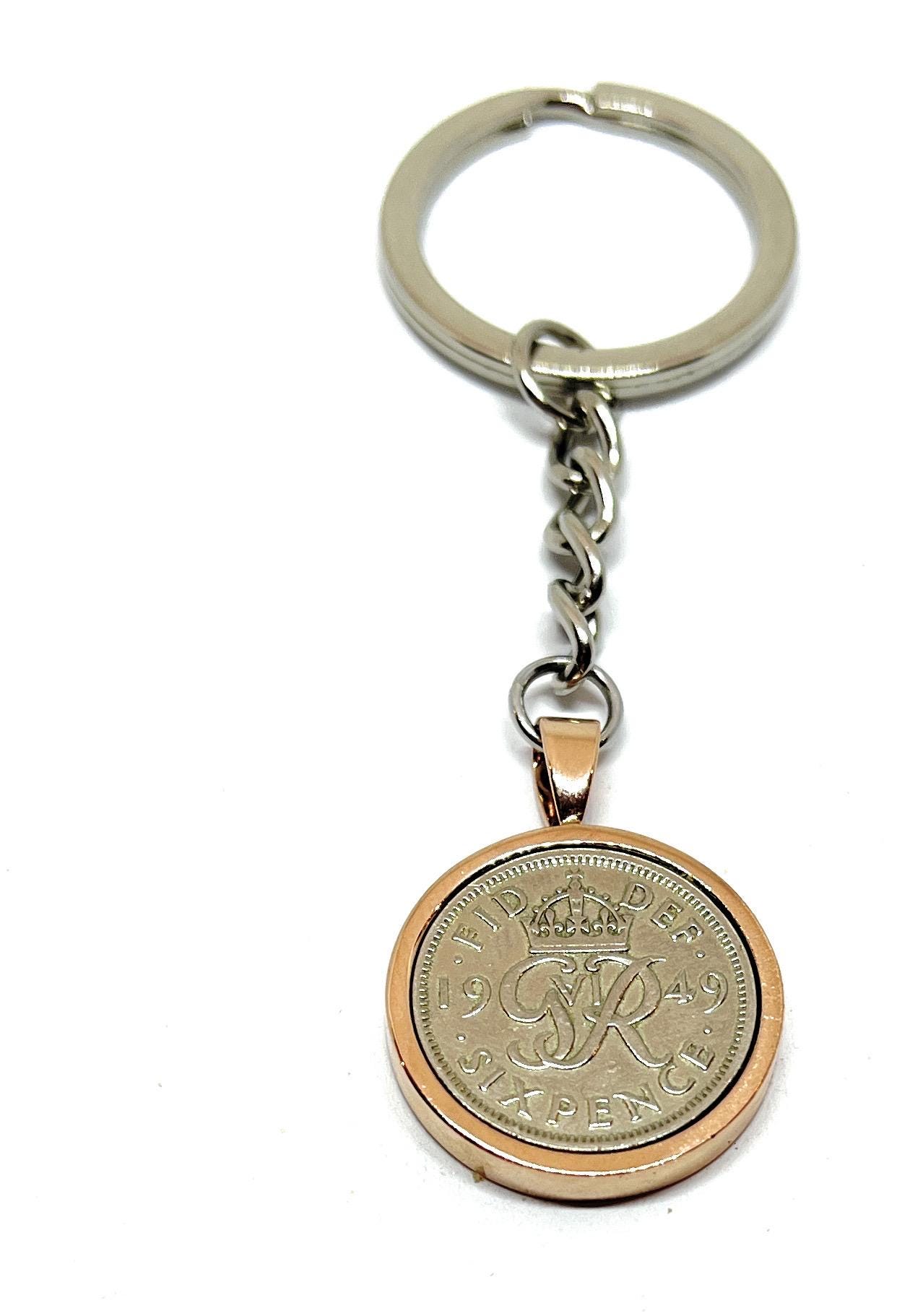 These keyrings have been lovingly handmade from vintage 1949 Sixpence Coins which have been polished. then inset in Silver, Gold or Rose Gold Pklated mounts. Perfect for a birthday or Anniversary gift.