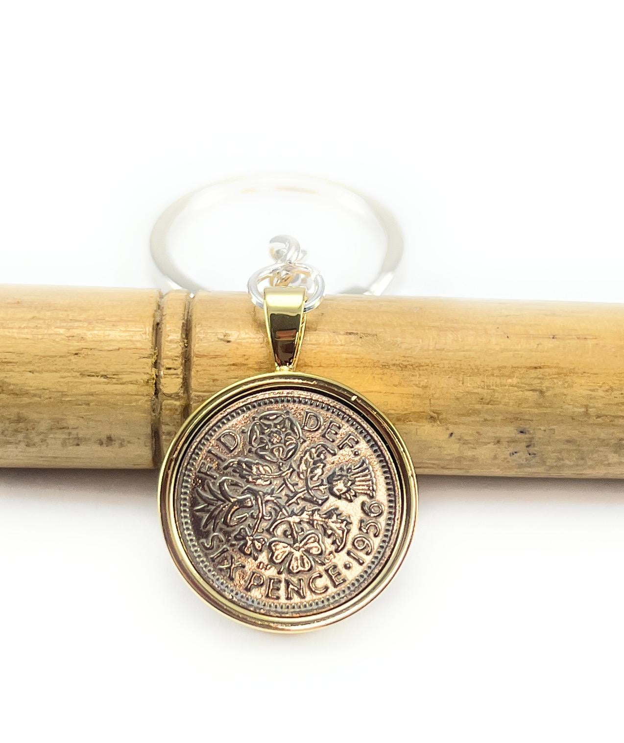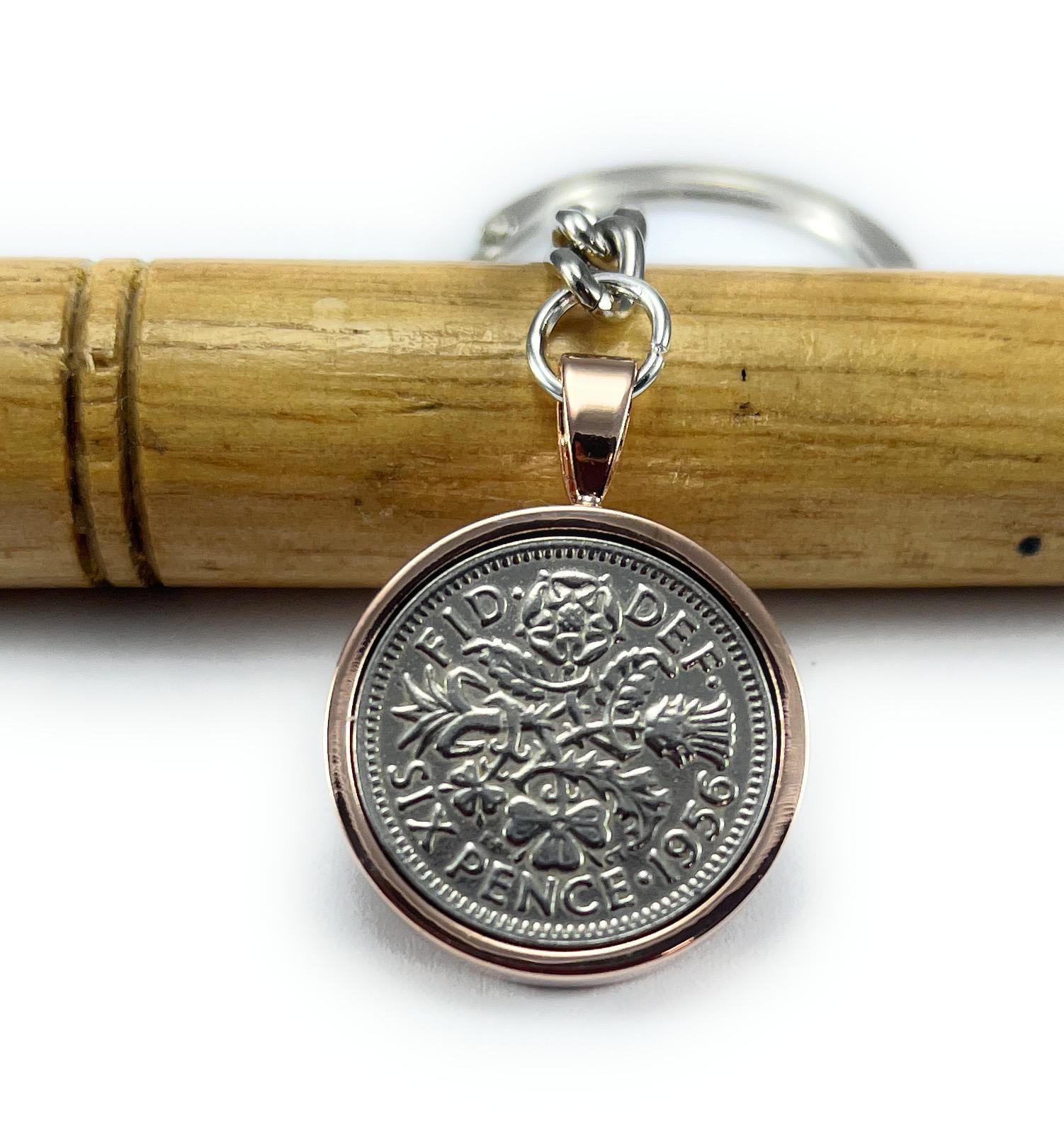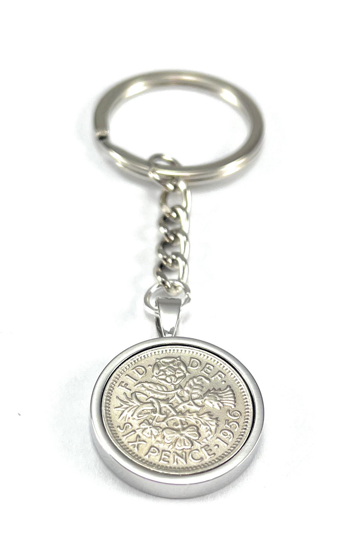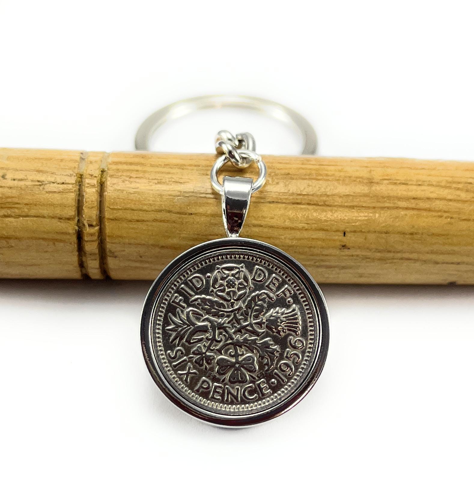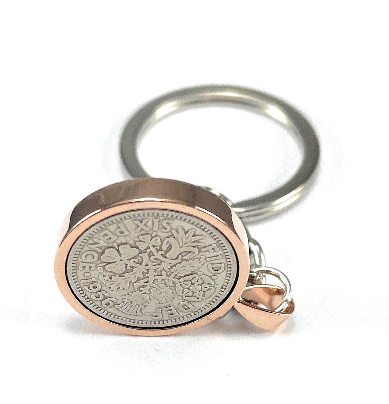 1956 69th Birthday Gift Sixpence Keyring: Silver, Gold or RoseGold Plated Mounts