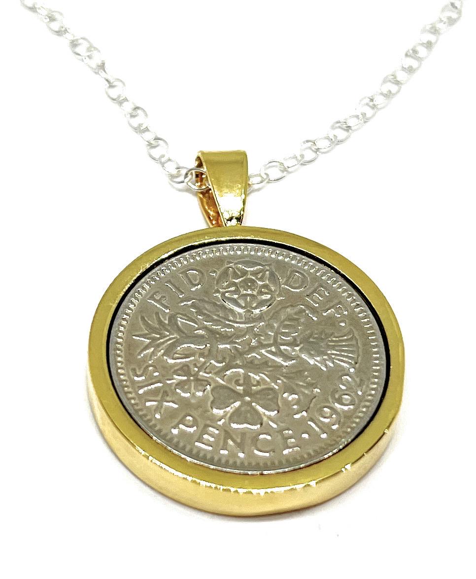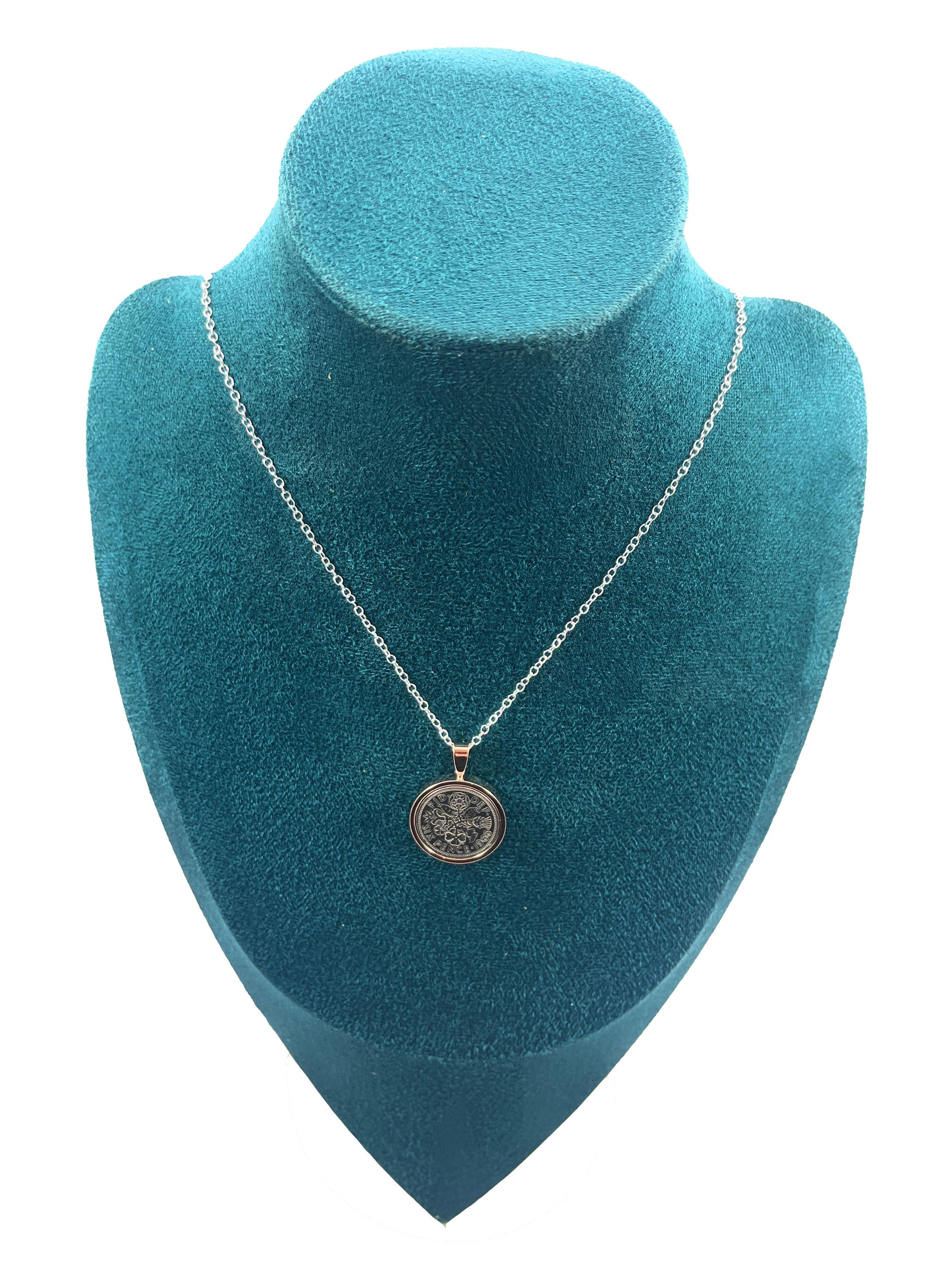 A genuine circulated 1962 polished sixpence mounted Silver, Gold or Rose Gold Plated on a sterling silver chain .